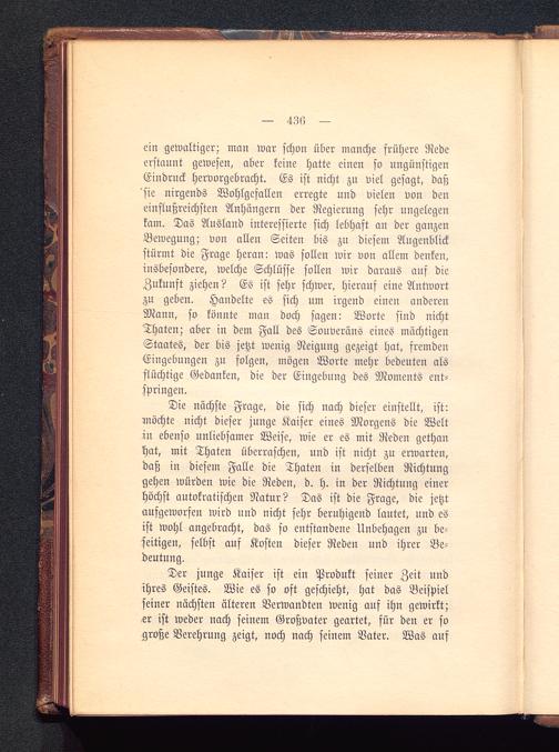 Der junge Kaiser ist ein Produkt seiner Zeit undihres Geistes. Wie es so oft geschieht, hat das Beispielseiner nächsten älteren Verwandten wenig auf ihn gewirkt;er ist weder nach seinem Großvater geartet, für den er sogroße Verehrung zeigt, noch nach seinem Vater. Was auf