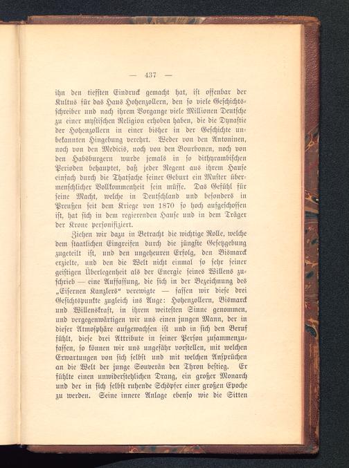 ihn den tiefsten Eindruck gemacht hat, ist offenbar derKultus für das Haus Hohenzollern , den so viele Geschichts-schreiber und nach ihrem Vorgange viele Millionen Deutsche zu eiuer mystischen Religion erhoben haben, die die Dynastieder Hohenzollern in einer bisher in der Geschichte un-bekannten Hingebung verehrt. Weder von den Antoninen,noch von den Medicis, noch von den Bourbonen, noch vonden Habsburgern wurde jemals in so dithyrambischenPerioden behauptet, daß jeder Regent aus ihrem Hauseeinfach durch die Thatsache seiner Geburt eiu Muster über-menschlicher Vollkommenheit seiu müsse. Das Gefühl fürseine Macht, welche in Deutschland und besonders inPreußeu seit dem Kriege von 1870 so hoch aufgeschossenist, hat sich in dem regierenden Hause und in dem Trägerder Krone personifiziert.