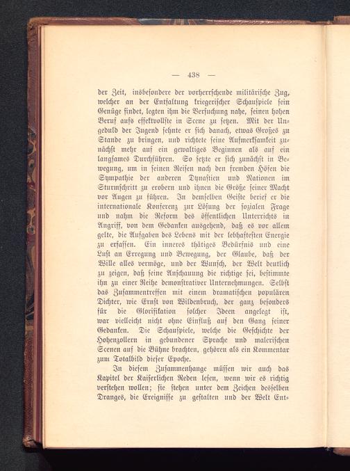 der Zeit, insbesondere der vorherrschende militärische Zug,welcher an der Entfaltung kriegerischer Schauspiele seinGenüge findet, legten ihm die Versuchung nahe, seinen hohenBeruf aufs effektvollste in Scene zu setzen. Mit der Un-geduld der Jugend sehnte er sich danach, etwas Großes zuStande zu bringen, und richtete seine Aufmerksamkeit zu-nächst mehr aus ein gewaltiges Beginnen als auf einlangsames Durchführen. So setzte er sich zunächst in Be-wegung, um in seinen Reisen nach den fremden Höfen dieSympathie der anderen Dynastien uud Nationen imSturmschritt zu erobern und ihnen die Größe seiner Machtvor Augen zu führen. In demselben Geiste berief er dieinternationale Konferenz zur Lösung der sozialen Frageund nahm die Reform des öffentlichen Unterrichts inAngriff, von dem Gedanken ausgehend, daß es vor allemgelte, die Aufgaben des Lebens mit der lebhaftesten Energiezu ersassen. Ein inneres thätiges Bedürfnis nnd eineLust an Erregung und Bewegung, der Glaube, daß derWille alles vermöge, und der Wunsch, der Welt deutlichzu zeigen, daß seine Anschauung die richtige sei, bestimmteihn zu einer Reihe demonstrativer Unternehmungen. Selbstdas Zusammentreffen mit einem dramatischen populärenDichter, wie Ernst von Wildenbruch , der ganz besondersfür die Glorifikation solcher Ideen angelegt ist,war vielleicht nicht ohne Einfluß auf den Gang seinerGedanken. Die Schauspiele, welche die Geschichte derHoheuzolleru in gebundener Sprache und malerischenScenen auf die Bühne brachten, gehören als ein Kommentarzum Totalbild dieser Epoche.