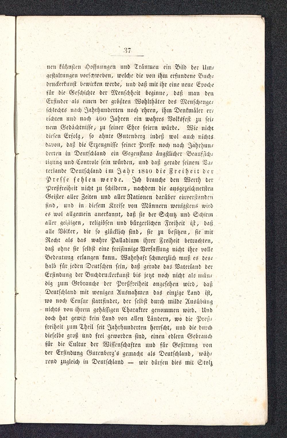 neu kühnsten Hoffnung",! und Träumen ei» Bild der Um;gesrMungiN vorschweben, welche die von ihm erfundene Buch-drnckerknnst dewirken werde,' und daß mit ihr eine neue Epochefür die Geschichte der Menschheit beginn«) daß man denErfinder als einen der größten Wohlthäter des Meusch.'ngc;schlecht^ mich Jahrhunderten noch ehren, ihm Denkmäler er;richte» und nach 4Ö0 Jahren ein wahre» Volksfest zu sei-vutxn Gedächtnisse, zu seiner Ehre feiern würde. Wie nichrdiesen Erfolg, so ahnte Gutenberg indeß wol auch nichtsdsvon, daß die Erzeugnisse seiner Presse noch nach Iahrhun.'verteil in Deutschland ein Gegenstano ängstlicher Beaufsich-tigung und Controle sein würden, und daß gerade seinem Va-mlande Deutschland im Jahr 1840 die Freiheit die rPresse fehlen werde. Ich brauche den Werth derPrcßfreihcit nicht zu schildern, nachdem die ausgezeichnetstenGeister aller Zeiten und aller Nationen darüber einverstandensind, und in diesem Kreise von Männern wenigstens wirdes wol allgemein anerkannt, daß sie der Schutz und Schirmaller geistigen, religiösen und bürgerlichen Freiheit ist, daßalle Völker, die so glücklich sind, sie zu besitzen, sie mitRecht als das wahre Palladium ihrer Freiheit betrachten,daß ohne sie selbst eine freisinnige Verfassung nicht ihre volleBedeutung erlangen kann. Wahrhaft schmerzlich muß es des-halb für jeden Deutschen sein, daß gerade das Vaterland derErfindung der Buchdruckcrkunst bis jetzt noch nicht als mün-big zum Gebrauche der Preßfreiheit angesehen wird, txißDeutschland mit wenigen Ausnahmen das einzige Land ist,wo noch Censur stattfindet, der selbst durch milde Ausübungnichts von ihrem gehässigen Charakter genommen wird. Unddoch hat gewis; kein Land von allen Ländern, wo die Preß-freiheit zum Theil seit Jahrhunderten herrscht, und die durchdieselbe groß und frei geworden sind, einen edlern Gebrauchfür die Cultur der Wissenschaften und für Gesittung vonder Erfindung Gurenberg's gemacht als Deutschland , wäh-renv zugleich in Deutschland — wir dürfen dies mit Stolz