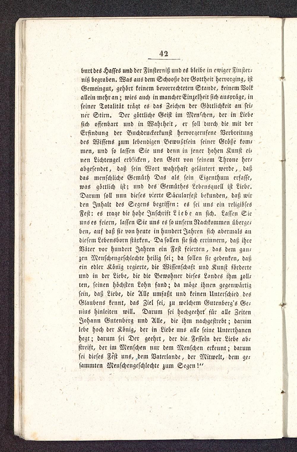 burtdes Hasses und der Finsterniß und es bleibe in ewiger Finster-twjj begraben. Was aus dem Schooße der Gottheit hervorging, istGemeingut, gehört keinem bevorrechteten Stande, keinem Volkallein mehran; wies auch in mancher Einzelheit sich auspräge, inseiner Totalität tragt es das Zeichen der Göttlichkeit an sei-ner Stirn. Der göttliche Geist im Menschen, der in Liebesich offenbart und in Wahlheit, er soll durch die mit derErfindung der Buchdruckerkunst hervorgerufene Verbreitungdes Wissens zum lebenoigcn Bewußtsein seiner Größe kom-men, und so lassen Sie uns denn in jener hohen Kunst ei-nen Lichtengel erblicken, den Gott von seinem Throne her-abgesendet, daß sein Wort wahrhaft geläutert werde, . daßdas menschliche Gemüth Das als sein Eigenthum erfasse,was göttlich ist; und des Gemüthes Lebensguell ist Liebe.Darum soll nun dieses vierte Sacularfest bekunden^ daß wirden Inhalt des Segens begriffen: es sei uns ein religiösesFest: es trage die hohe Inschrift Liebe an sich. Lassen Sieuns es feiern, lassen Sie uns es so unsern Nachkommen überge-ben, auf daß sie von heute in hundert Jahren sich abermals andiesem Lebensborn stärken. Da sollen sie sich errinnern, daß ihreVäter vor hundert Jahren ein Fest feierten, das dem gan-zen Menschengeschlechte heilig sei; da sollen sie gedenken, daßein edler König regierte, die Wissenschaft und Kunst förderteund in der Liebe, die die Bewohner dieses Landes ihm zoll-ten, seinen höchsten Lohn fand; da möge ihnen gegenwärtigsein, daß Liebe, die Alle umfaßt und keinen Unterschied desGlaubens kennt, das Ziel sei, zu welchem Gutenbcrg's Ge-nius hinleiten will. Darum sei hochgeehrt für alle ZeitenJohann Gutenberg und Alle, die ihm nachgestrebt; darumlebe hoch der König, der in Liebe uns alle seine Unterthanenhegt; darum sei Der geehrt, der die Fesseln der Liebe ab-streift, der im Menschen nur dem Menschen erkennt; darumsei dieses Fest uns, dem Vaterlande, der Mitwelt, dem ge-summten Menschengeschlechte zum Segen!"