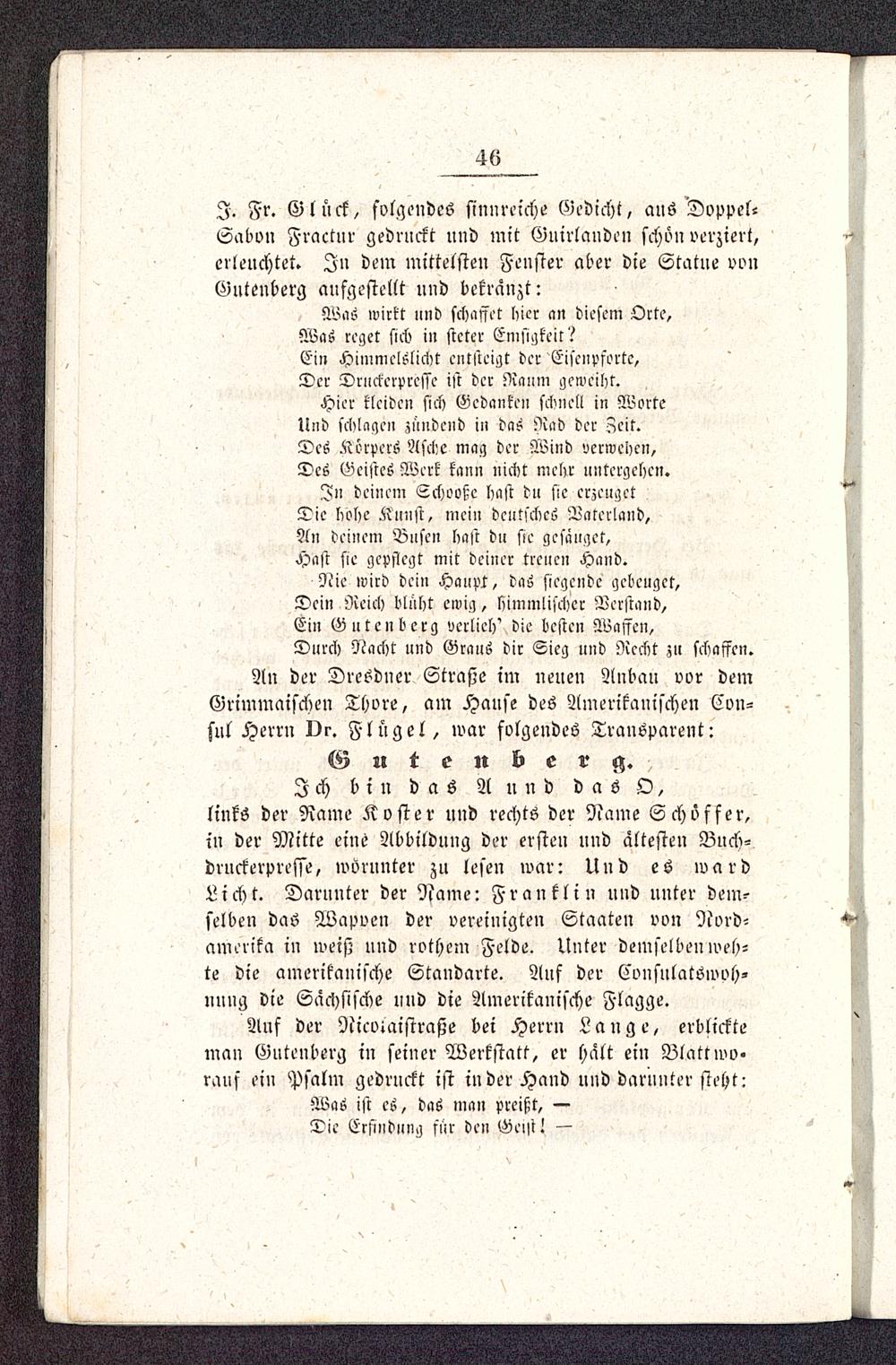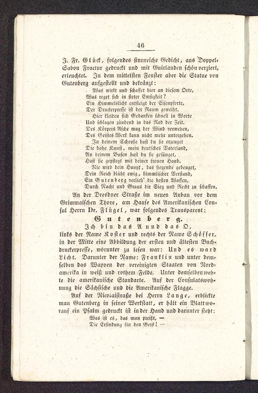 An der Dresdner Straße im neuen Anbau vor demGrimmaischen Thore, am Hause des Amerikanischen Cvn-sul Herrn Dr. Flügel, war folgendes Transparent:G u t e n b e r g.Ich bin das A u n d das O,links der Rame Koster und rechts der Name Schvffer,in der Mitte eine Abbildung der ersten und ältesten Bnch-druckerpresse, worunter zu lesen war: Und es wardLicht. Darunter der Name: Fr an kl in und unter dem-selben das Wapven der vereinigten Staaten von Nord-amerika in weiß und rothem Felde. Unter demselben weh-te die amerikanische Standarte. Auf der Cvnsnlatöwoh-nnng die Sächsische und die Amerikanische Flagge.