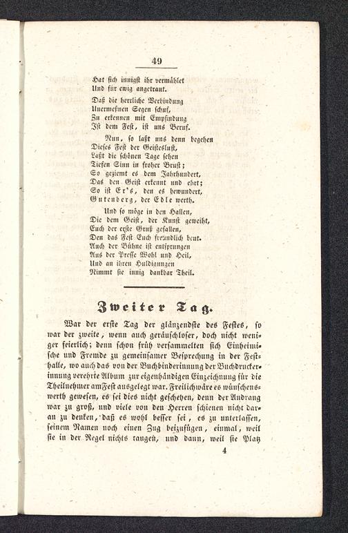 Nun, so laßt uns denn begehe»!Dieses Fest der Geisteslust/Laßt die schönen Tage sehenTiefen Sinn in froher Brust;So geziemt es dem Jahrhundert,Das den Geist erkennt und ehrt;So ist Er's, den es bewundert,G u tcn b c r g, der Edle werth.
