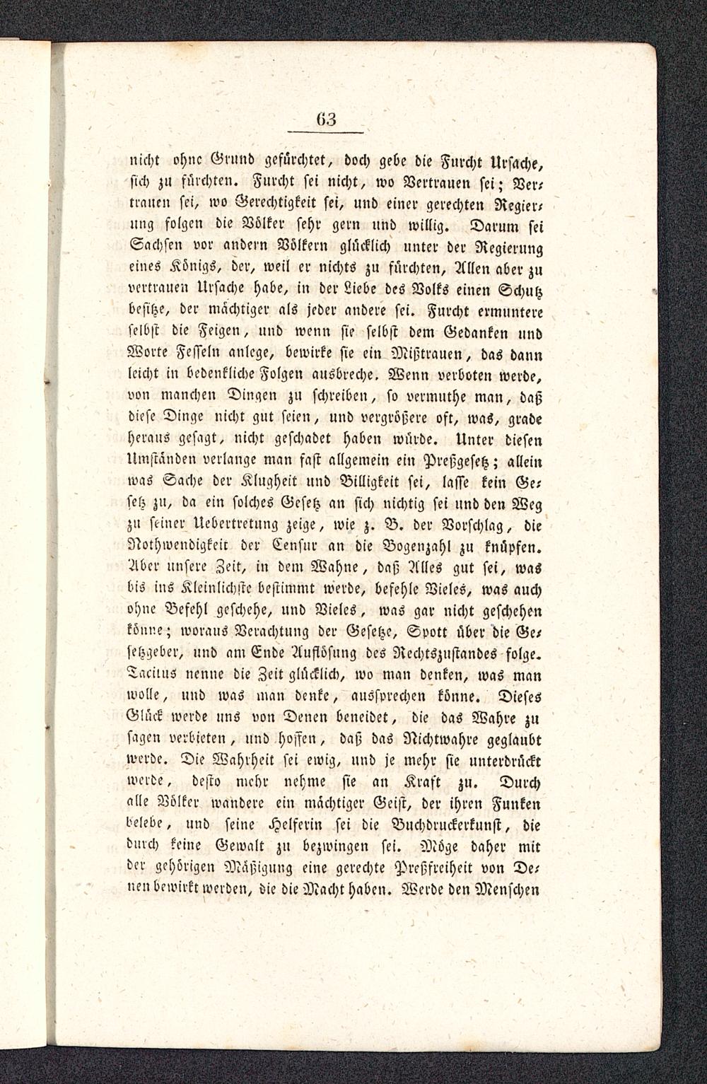 nicht ohne Grund gefürchtet, doch gebe die Furcht Ursache,sich zu furchten. Furcht sei nicht, wo Vertrauen sei; 93mtrauen sei, wo Gerechtigkeit sei, und einer gerechten Negier,ung folgen die Völker sehr gern und willig. Darum seiSachsen vor andern Völkern glücklich unter der Negierungeines Königs, der, weil er nichts zu fürchten. Allen aber zuvertrauen Ursache habe, in der Liebe des Volks einen Schutzbesitze, der mächtiger als jeder andere sei. Furcht ermuntereselbst die Feigen, und wenn sie selbst dem Gedanken undWorte Fesseln anlege, bewirke sie ein Mißtrauen, das dannleicht in bedenkliche Folgen ausbreche. Wenn verboten werde,von manchen Dingen zu schreiben, so vermuthe man, daßdiese Dinge nicht gut seien, und vergrößere oft, was, gradeheraus gesagt, nicht geschadet haben würde. Unter diesenUmstanden verlange man fast allgemein ein Preßgesetz; alleinwas Sache der Klugheit und Billigkeit sei, lasse kein Ge-seh zu, da ein solches Gesetz an sich nichtig sei und den Wegzu seiner Uebcrtretung zeige, wie z. B. der Vorschlag, dieNothwendigkeit der Censur an die Bogenzahl zu knüpfen.Aber unsere Zeit, in dem Wahne, daß Alles gut sei, wasbis ins Kleinlichste bestimmt werde, befehle Vieles, was auchohne Befehl geschehe, und Vieles, was gar nicht geschehenkönne; woraus Verachtung der Gesetze, Spott über die G»setzgeber, und am Ende Auflösung des Ncchtszustandes folge.Tacilus nenne die Zeit glücklich, wo man denken, was manwolle, und was man denke, aussorechen könne. DiesesGlück werde uns von Denen beneidet, die das Wahre zusagen verbieten, und hoffen, daß das Nichtwahre geglanbtwerde. Die Wahrheit sei ewig, und je mehr sie unterdrücktwerde, desto mehr nehme sie an Kraft zu. Durchalle Volker wandere ein mächtiger Geist, der ihren Funkenbelebe, nnd seine Helferin sei die Buchdruckerkunst, diedurch keine Gewalt zu bezwingen sei. Möge daher mitder gehörigen Mäßigung eine gerechte Preßfreihcit von De-neu bewirkt werden, die die Macht haben. Werde den Menschen