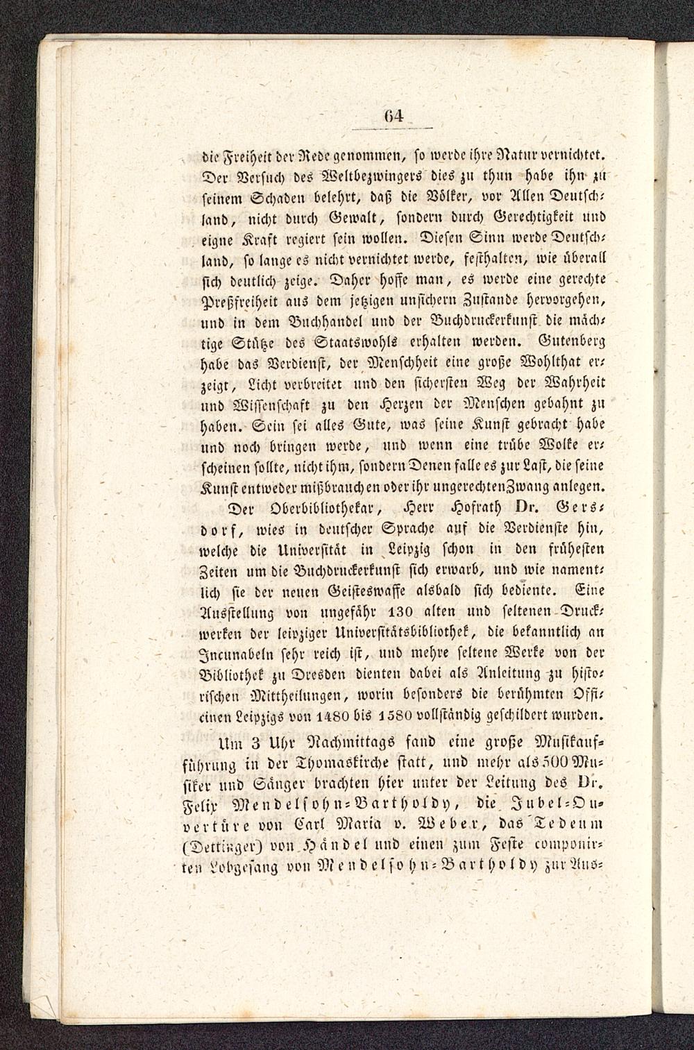 Um 3 Uhr Nachmittags fand eine große Musikauf-führung in der Thomaskirche statt, und mehr al6 5l)0Mu-siker und Sanger brachten hier unter der Leitung deö Di-,Felix Meudelsohn - Barthvldr), die Jubel-Ou-verture vvn Carl Maria v. Weber , das'TedeumsDettii'.ger) vvn.Handel und einen jiirn Feste cvmponir-teu öol'gefarig von M end el so h >i - B a r t h o l d y zur Aus-