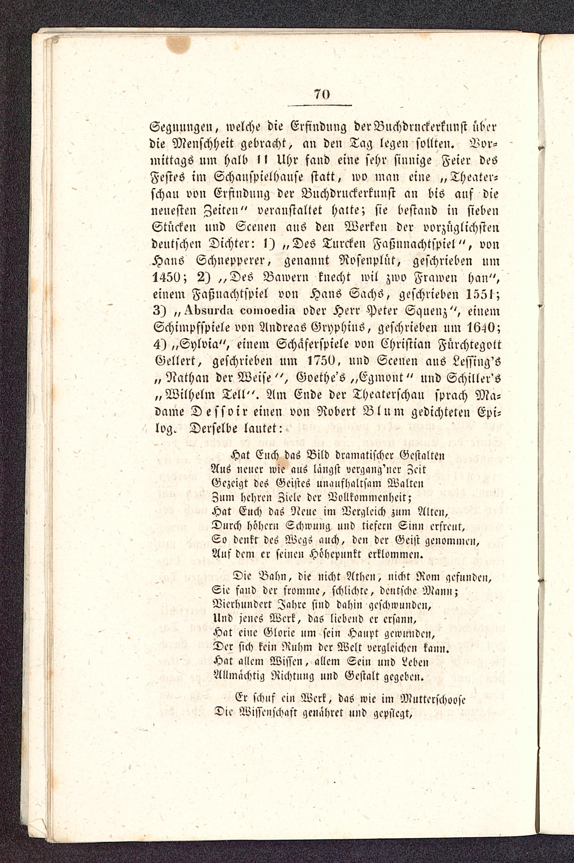4) „Sylvia", einem Schaferspiele von Christian FürchtegottGellert , geschrieben um 1750, und Scenen ans Lessing's„ Nathan der Weise", Goethe's „Egmont" und Schiller '6„Wilhelm Teil ". Am Ende der Theaterschau sprach Ma-Vame Dessoir einen von Robert Blum gedichteten Epi-log. Derselbe lautet: