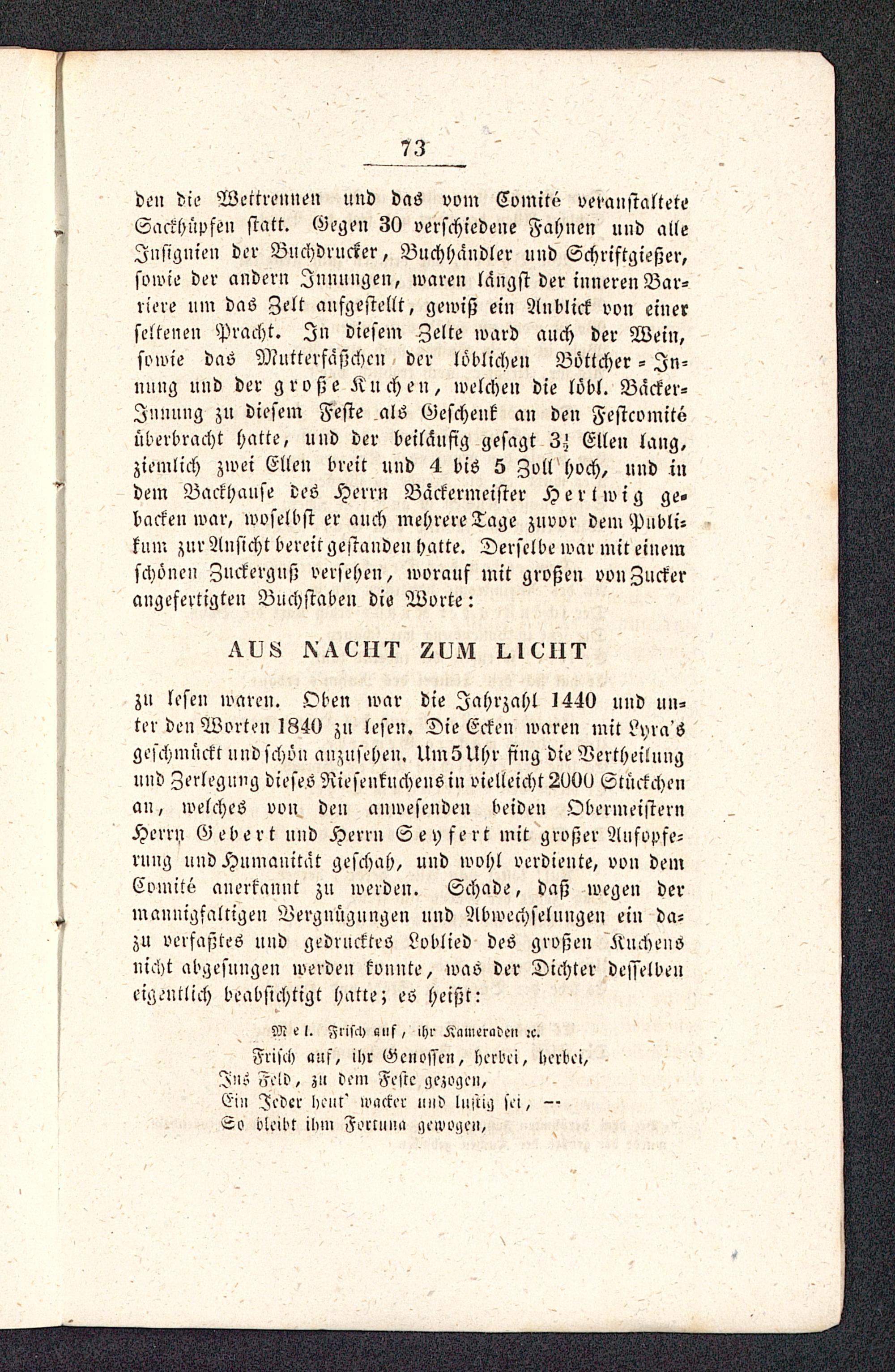zu lesen waren. Oben war die Jahrzahl 1440 und uu-ter den Worten zu lesen. Die Ecken waren mit Lyra'Sgeschmückt undschvn anznsehen. Um5Uhr fing die Verkeilungund Zerlegung dieses Riesenkucheusiu vielleicht 2U00 Stückchenan, welches von den anwesenden beiden ObermeisternHerrn G ebert und Herrn Seyfert mit großer Aufopse-rung und Humanität geschah, und wohl verdiente, von demComite anerkannt zu werden. Schade, daß wegen dermannigfaltigen Vergnügungen und Abwechselungen ein da-zn verfaßtes und gedrucktes Loblied des großen Kuchensnicht abgesungen werden konnte, was der Dichter desselbeneigentlich beabsichtigt hatte; es heißt: