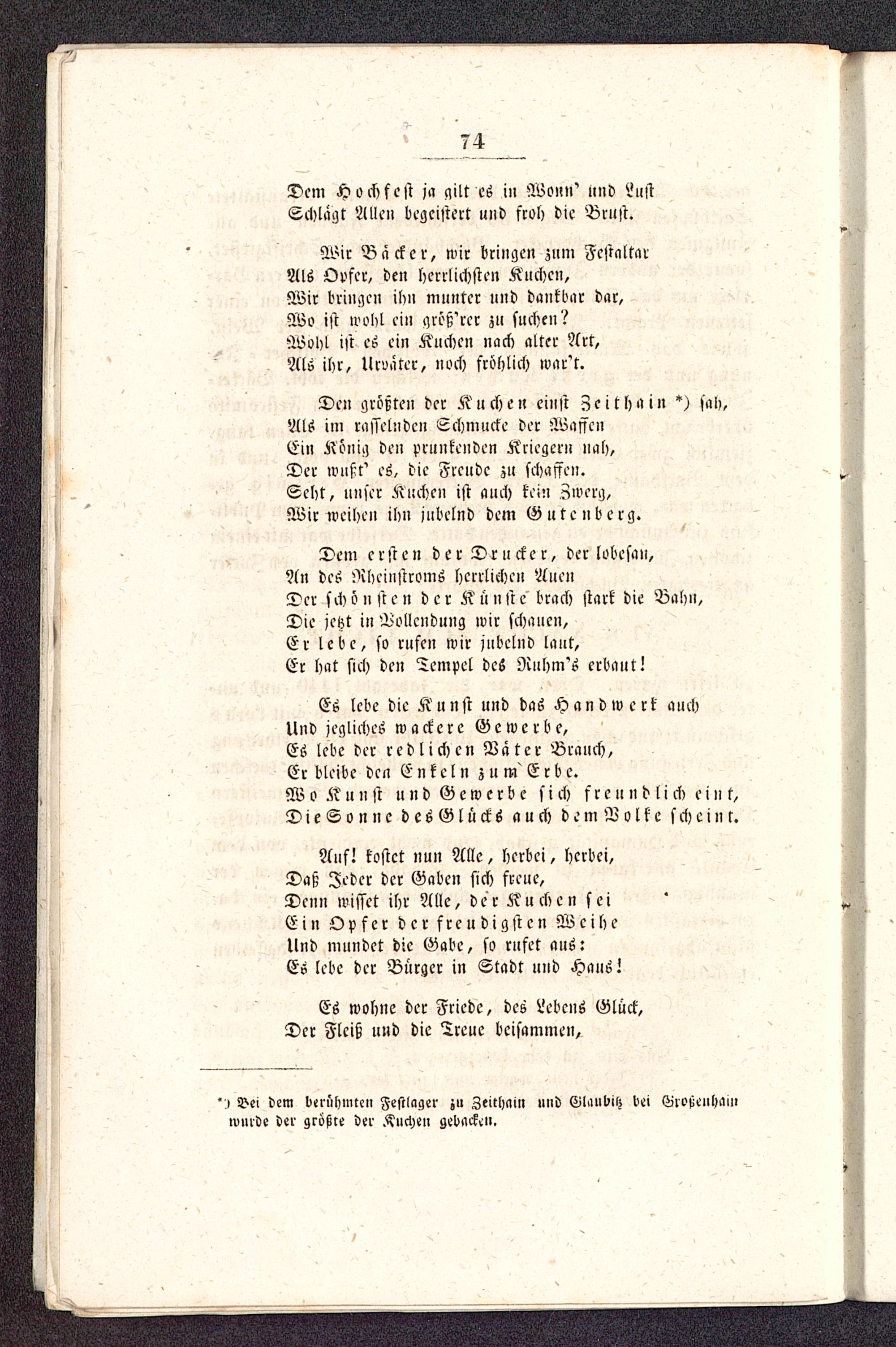 Den größten der Kuchen einst Zeit ha in *) sah,Als im rasselnden Schmucke der WaffenEin König den prunkenden Kriegern nah,Der wußt' es, die Freude zu schaffen.Seht, unser Kuchen ist anch kein Zwerg,Wir weihen ihn jubelnd dem Gutenberg.