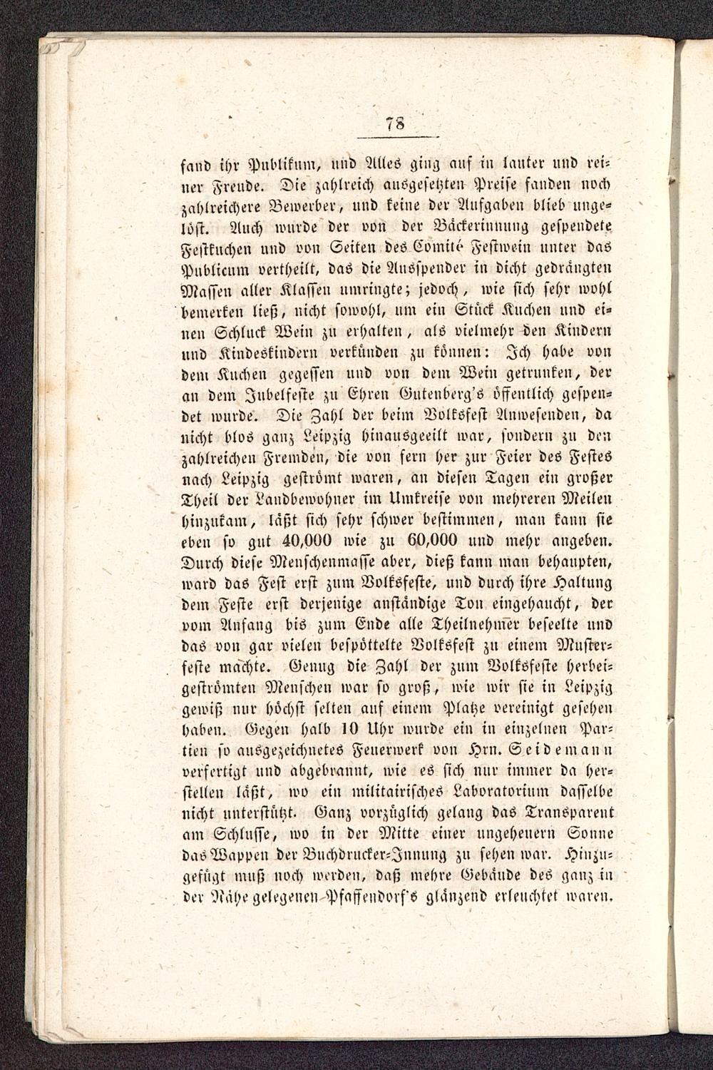 fand ihr Publikum, und Alles ging auf in lauter und rei-»er Freude. Die zahlreich ausgefeltteu Preise fanden nochzahlreichere Bewerber, und keine der Aufgaben blieb uuge-lost. Auch wurde der von der Backeriunnng gespendeteFestkuchen und von Seiten deö Comilt- Festwein unter dasPublicum vertheilt, daö die Auöspeuder in dicht gedrängtenMassen aller Klassen nmriugte; jedoch, wie sich sehr wvhlbemerken ließ, nicht sowohl, um ein Stück Kuchen und ei-nen Schluck Wein zu erhalten, als vielmehr Gen Kindernund Kindeskindern verkünden zu köuuen: Ich habe vondem Kuchen gegessen und von dem Wein getrunken, deran dem Jubelfeste zu Ehren Gutenberg'6 öffentlich gespen-det wurde. Die Zahl der beim Volksfest Anwesenden, danicht blos ganz Leipzig hinausgeeilt war, sondern zu denzahlreichen Fremden, die von fern her zur Feier des Festesnach Leipzig geströmt waren, an diesen Tagen ein großerTheil der Landbewohner im Umkreise von mehreren Meilenhinzukam, läßt sich sehr schwer bestimmen, man kann sieeben so gut 40,000 wie zu 60,000 und mehr angeben.Durch diese Menschenmasse aber, dieß kann man behaupten,ward das Fest erst znm Volksfeste, und durch ihre Haltungdem Feste erst derjenige anstandige Ton eingehaucht, dervom Anfang bis zum Ende alle Theilnehmer beseelte unddas von gar vielen bespöttelte Volksfest zu einem Muster-feste machte. Genug die Zahl der zum Volksfeste herbei-geströmten Menschen war so groß, wie wir sie in Leipzig gewiß nur höchst selten auf einem Platze vereinigt gesehenhaben. Gegen halb 10 Uhr wurde ein in einzelneu Par-tien so ausgezeichnetes Feuerwerk vou Hrn. S e i d e m an nverfertigt und abgebrannt, wie es sich nnr immer da her-stellen laßt, wo ein militärisches Laboratorium dasselbenicht unterstützt. Ganz vorzüglich gelang das Transparentam Schlüsse, wo in der Mitte einer ungeheuern Sonnedas Wappen der Buchbrucker-Jnnnug zu sehen war. Hinzu-gefügt muß noch werden, daß mehre Gebäude des ganz inder NäW gelegenen Pfaffendorf's glänzend erleuchtet waren.
