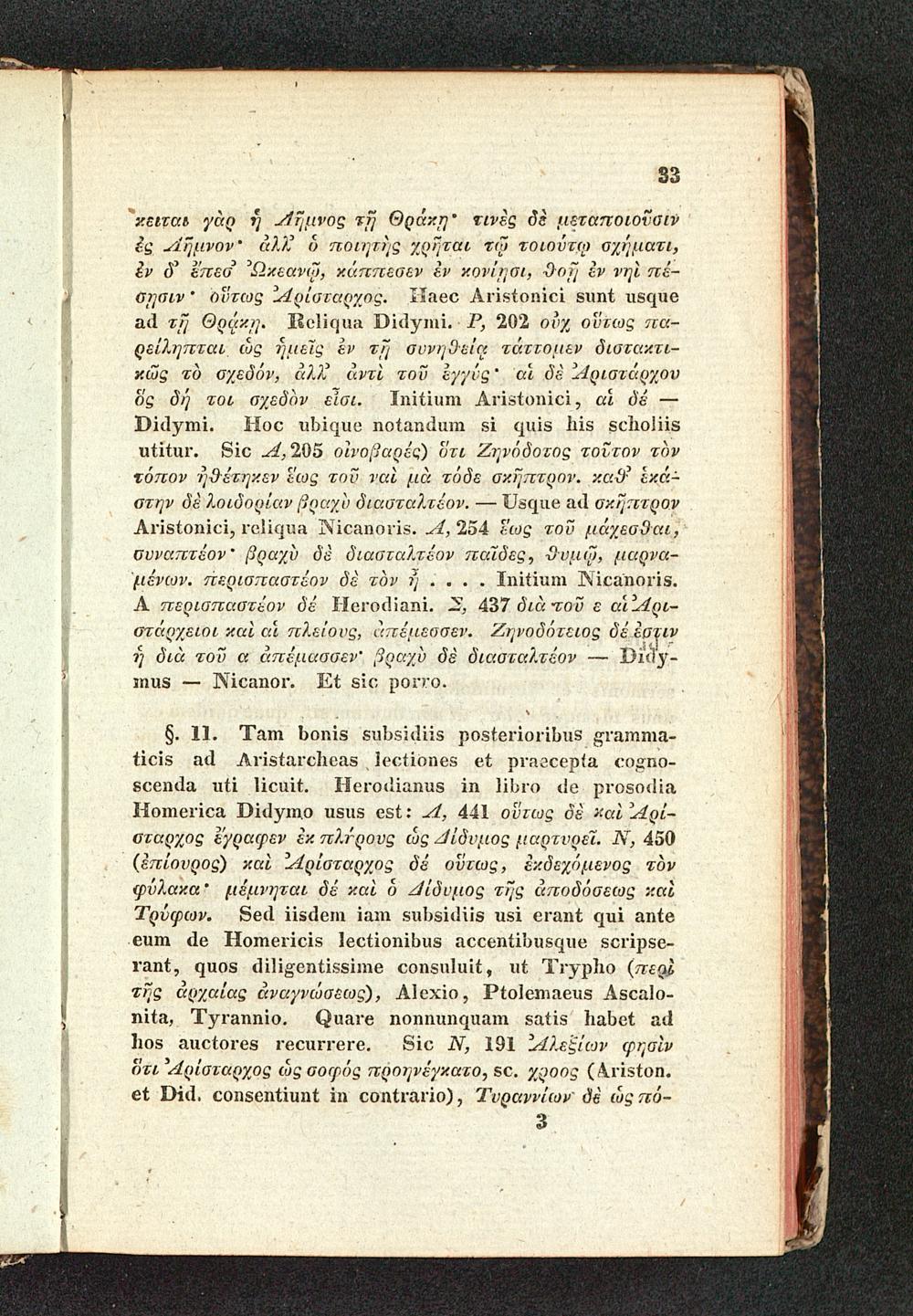 §. 11. Tam bonis subsidiis posterioribus gramma-ticis ad Aristarcheas lectiones et praecepta cogno-scenda uti licuit. Herodianus in libro de prosodiaHomerica Didymo usus est: 1, 441 οὕτως δὲ καὶ Αρί-σταρχος ἔγραφεν ἐκ πλήρους ὡς Δίδυμος μαρτυρεῖ. Ν, 450( ἐπίουρος) καὶ ᾿Αρίσταρχος δέ οὕτως, ἐκδεχόμενος τὸνφύλακα · μέμνηται δέ καὶ ὁ Δίδυμος τῆς ἀποδόσεως καὶΤρύφων. Sed iisdem iam subsidiis usi erant qui anteeum de Homericis lectionibus accentibusque scripse-rant, quos diligentissime consuluit, ut Trypho( περὶτῆς ἀρχαίας ἀναγνώσεως), Alexio, Ptolemaeus Ascalo-nita, Tyrannio. Quare nonnunquam satis habet adhos auctores recurrere. Sic N, 191 Αλεξίων φησὶνὅτι Αρίσταρχος ὡς σοφός προγνέγκατο, sc. χρoοs( Ariston.et Did. consentiunt in contrario), Τυραννίων δὲ ὡς πό-