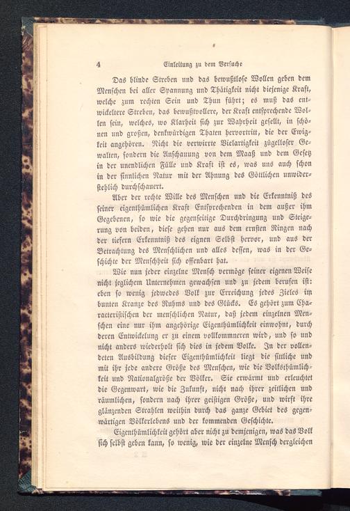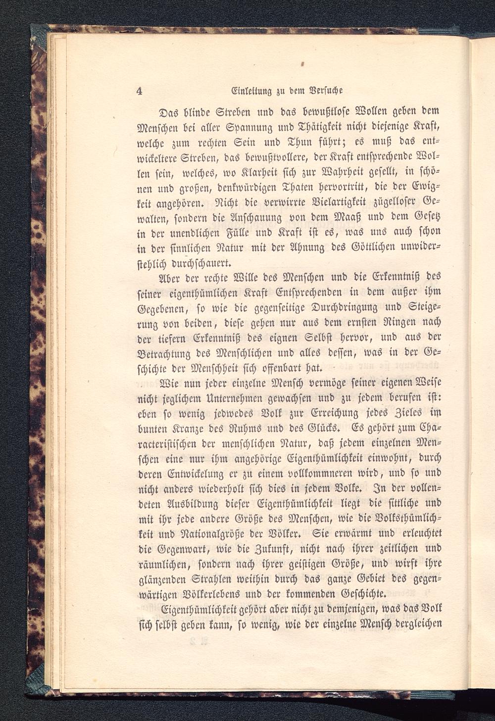 Wie nun jeder einzelne Mensch vermöge seiner eigenen Weisenicht jeglichem Unternehmen gewachsen und zu jedem berufen ist:eben so wenig jedwedes Volk zur Erreichung jedes Zieles imbunten Kranze des Ruhms und des Glücks. Es gehört zum Cha-racteristischen der menschlichen Natur, daß jedem einzelnen Men-schen eine nur ihm Angehörige Eigenthümlichkeit einwohnt, durchderen Entwickelung er zu einem vollkommncren wird, und so undnicht anders wiederholt sich dies in jedem Volke. In der vollen-deten Ausbildung dieser Eigenthümlichkeit liegt die sittliche undmit ihr jede andere Größe des Menschen, wie die Volksthümlich-keit und Nationalgröße der Völker. Sie erwärmt und erleuchtetdie Gegenwart, wie die Zukunft, nicht nach ihrer zeitlichen undräumlichen, sondern nach ihrer geistigen Größe, und wirft ihreglänzenden Strahlen weithin durch das ganze Gebiet des gegen-wärtigen Völkerlebens und der kommenden Geschichte.