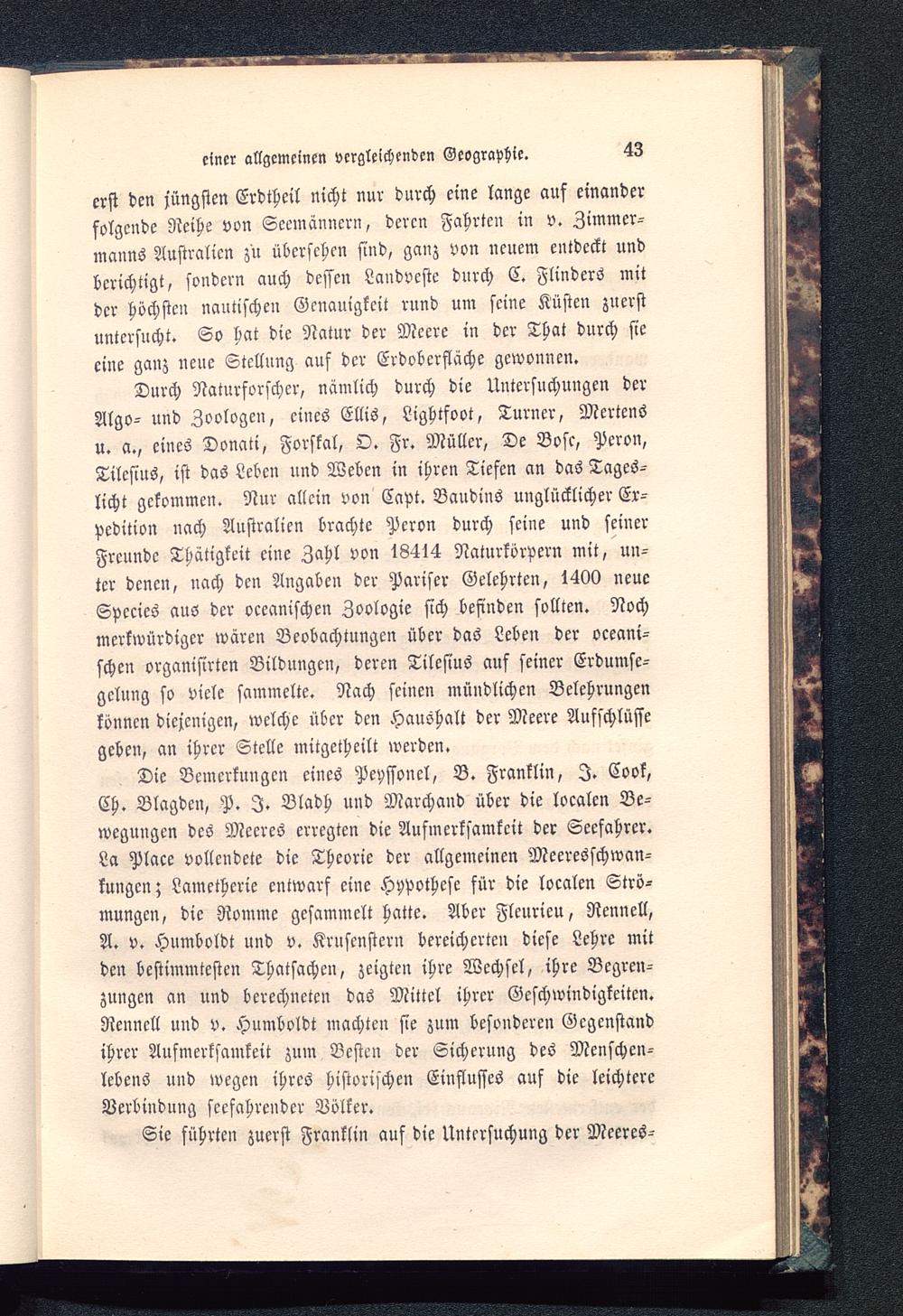 Die Bemerkungen eines Pepssoncl, B. Franklin , I. Cook,Eh. Blagden, P. I. Vladh und Marchand über die localen Be-wegungen des Meeres erregten die Aufmerksamkeit der Seefahrer.La Place vollendete die Theorie der allgemeinen Meeresschwan-kungen; Lametherie entwarf eine Hypothese für die localen Strö-mungen, die Nomme gesammelt hatte. Aber Fleurieu, Nennell,A. v. Humboldt und v. Krusenstern bereicherten diese Lehre mitden bestimmtesten Thatsachen, zeigten ihre Wechsel, ihre Begren-zungen an und berechneten das Mittel ihrer Geschwindigkeiten.Nennell und v. Humboldt machten sie zum besonderen Gegenstandihrer Aufmerksamkeit zum Besten der Sicherung des Menschen-lebens und wegen ihres historischen Einflusses auf die leichtereVerbindung seefahrender Völker.