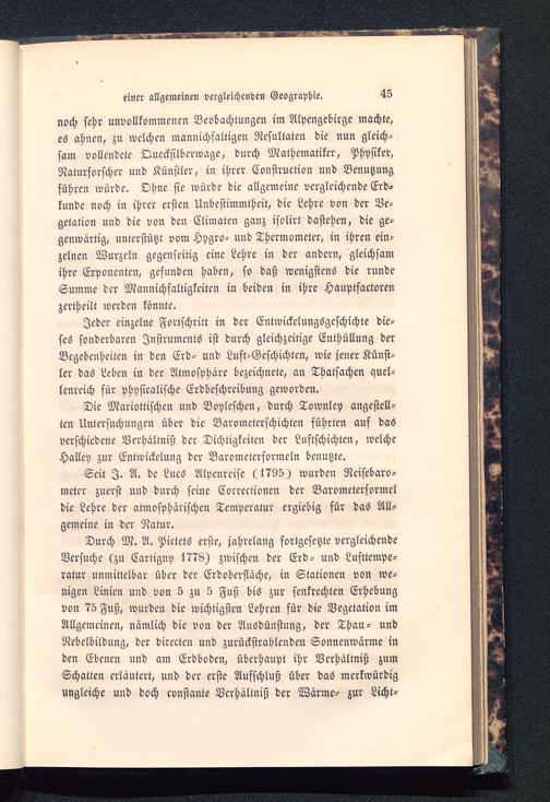 Durch M. A. Pictets erste, jahrelang fortgesetzte vergleichendeVersuche (zu Cartigny 1778) zwischen der Erd- und Lufttempe-ratur unmittelbar über der Erdoberfläche, in Stationen von we-nigen Linien und von 5 zu 5 Fuß bis zur senkrechten Erhebungvon 75 Fuß, wurden die wichtigsten Lehren für die Vegetation imAllgemeinen, nämlich die von der Ausdünstung, der Thau- undNebelbildung, der directen und zurückstrahlenden Sonncnwärme inden Ebenen und am Erdboden, überhaupt ihr Verhältniß zumSchatten erläutert, und der erste Aufschluß über das merkwürdigungleiche und doch constante Verhältniß der Wärme- zur Licht-
