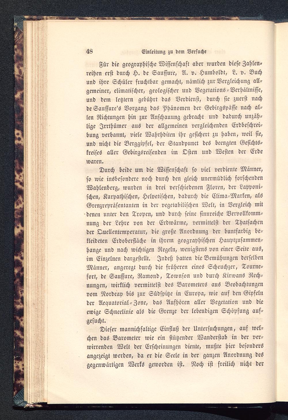Für die geographische Wissenschaft aber wurden diese Zahlen-reihen erst durch H. de Saussure, A. v. Humboldt, L. v. Buchund ihre Schüler fruchtbar gemacht, nämlich zur Verglcichung all-gemeiner, klimatischer, geologischer und Vegetations-Verhältnisse,und dem letztern gebührt das Verdienst, durch sie zuerst nachdeSaussure's Vorgang das Phänomen der Gebirgspässe nach al-len Richtungen hin zur Anschauung gebracht und dadurch unzäh-lige Irrthümer aus der allgemeinen vergleichenden Erdbeschrei-bung verbannt, viele Wahrhditcn ihr gesichert zu haben, weil sie,und nicht die Berggipfel, der Standpunct des beengten Gesichts-kreises aller GebirgSreisenden im Osten und Westen der Erdewaren.