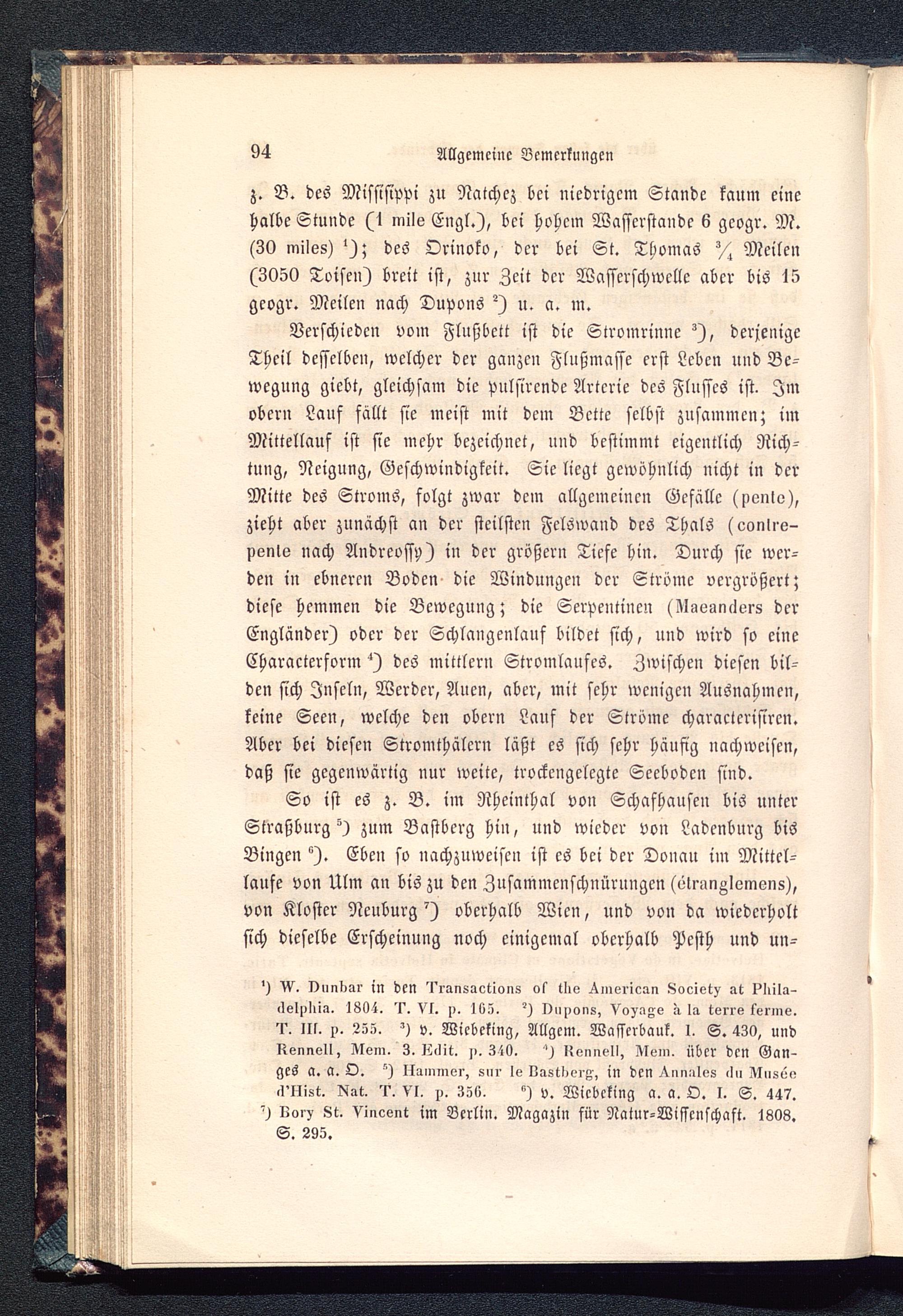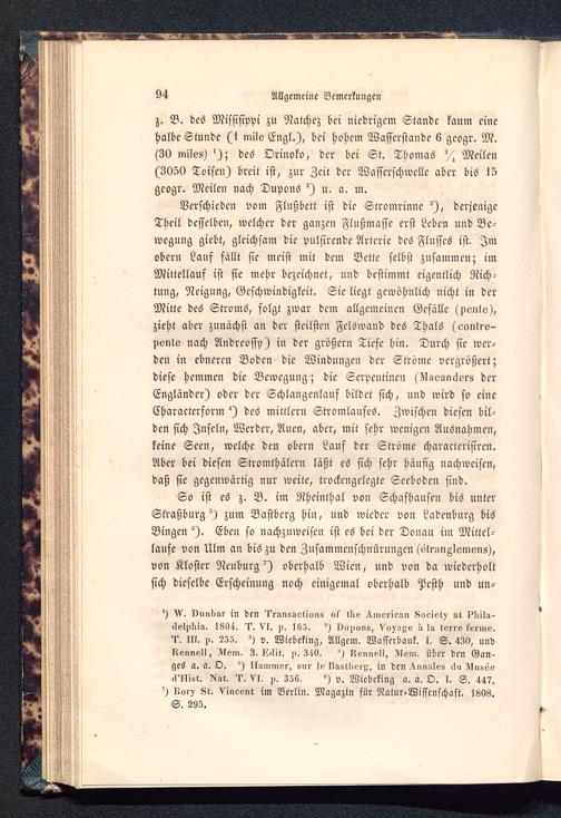 z. B. des Missisippi zu Natchcz bei niedrigem Stande kaum einehalbe Stunde (1 mile Engl .), bei hohem Wasscrstande 6 gcogr. M.(30 miles) '); des Orinoko , der bei St. Thomas X Meilen(3050 Toisen) breit ist, zur Zeit der Wasserschwellc aber bis 15geogr. Meilen nach Dupons ^) u. a. m.