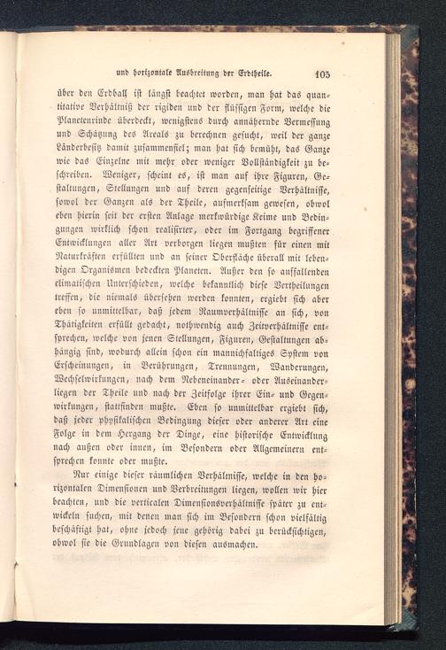 über den Erdball ist längst beachtet worden, man hat das quan-titative Verhältniß der rigiden und der flüssigen Form, welche diePlanetenrindc überdeckt, wenigstens durch annähernde Vermessunguud Schätzung des Areals zu berechnen gesucht, weil der ganzeLändcrbcsitz damit zusammenfiel; man hat sich bemüht, das Ganzewie das Einzelne mit mehr oder weniger Vollständigkeit zu be-schreiben. Weniger, scheint es, ist man auf ihre Figuren, Ge-staltungen, Stellungen und auf deren gegenseitige Verhältnisse,sowol der Ganzen als der Theile, aufmerksam gewesen, obwoleben hierin seit der ersten Anlage merkwürdige Keime und Bedin-gungen wirklich schon rcalisirter, oder im Fortgang begriffenerEntwicklungen aller Art verborgen liegen mußten für einen mitNaturkräften erfüllten uud an seiner Oberfläche überall mit leben-digen Organismen bedeckten Planeten. Außer den so ausfallendenclimatischcn Unterschieden, welche bekanntlich diese Vcrtheilungcntreffen, die niemals übersehen werden konnten, ergiebt sich abereben so unmittelbar, daß jedem Naumverhältnisse an sich, vonThätigkeiten erfüllt gedacht, nothwendig auch Zeitverhältnisse ent-sprechen, welche von jenen Stellungen, Figuren, Gestaltungen ab-hängig sind, wodurch allein schon ein mannichfaltiges System vonErscheinungen, in Berührungen, Trennungen, Wanderungen,Wechselwirkungen, nach dem Nebeneinander- oder Auöeinander-liegen der Theile und nach der Zeitfolge ihrer Ein- und Gegen-wirkuugen, stattfinden mußte. Eben so unmittelbar crgiebt sich,daß jeder physikalischen Bedingung dieser oder anderer Art eineFolge in dem Hergang der Dinge, eine historische Entwicklungnach außen oder innen, im Besondern oder Allgemeinem ent-sprechen konnte oder mußte.