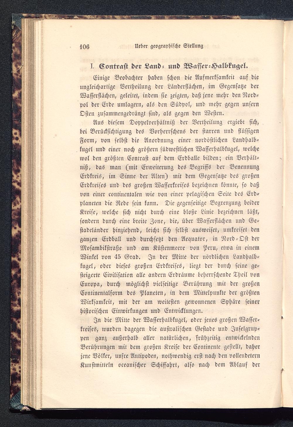 Einige Beobachter haben schon die Aufmerksamkeit auf dieungleichartige Verchcilung der Läuderflächen, im Gegensatze derWasserflächen, geleitet, indem sie zeigten, daß jene mehr den Nord-pol der Erde umlagern, als den Südpol , und mehr gegen unsernOsten zusammengedrängt sind, als gegen den Westen.