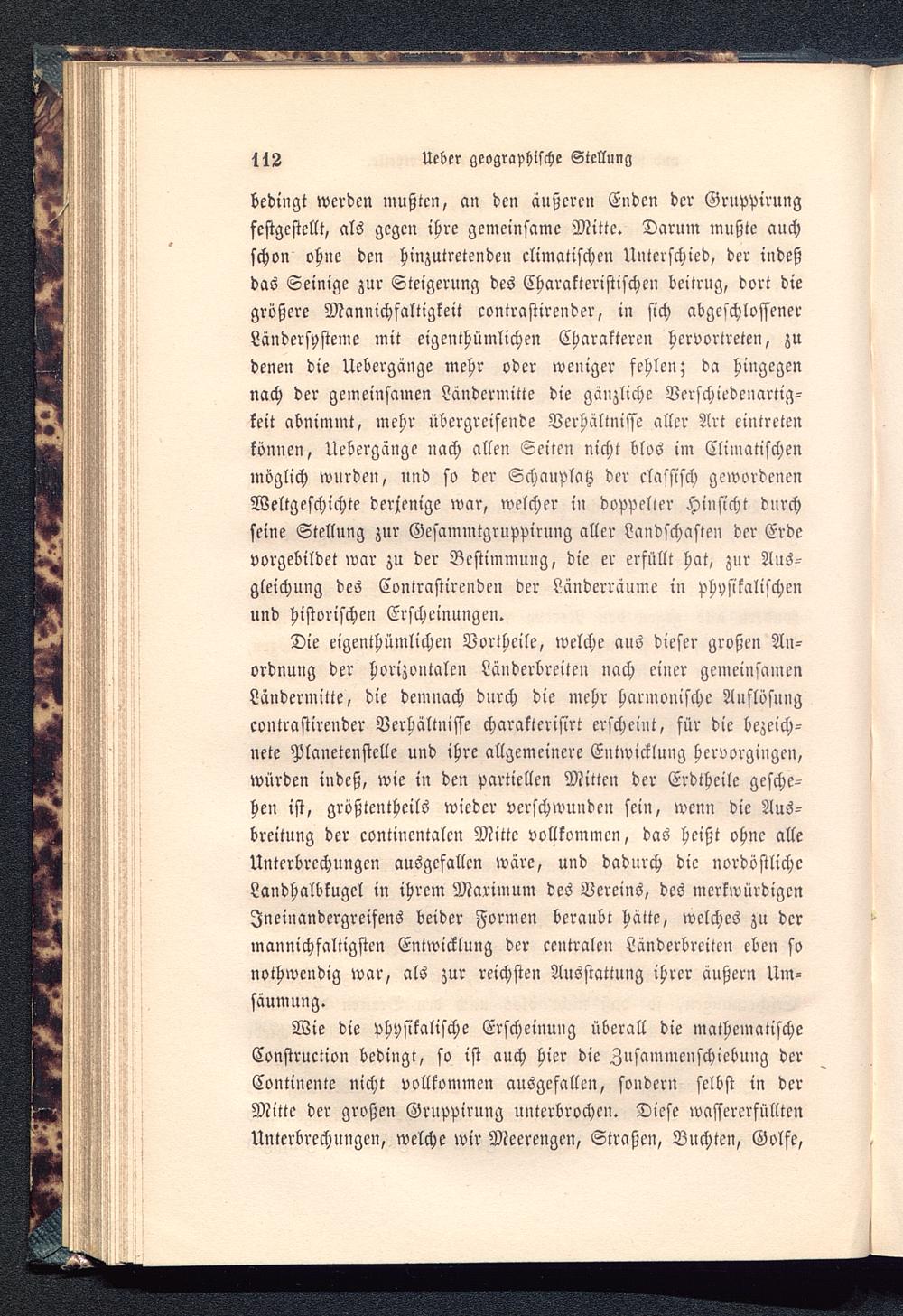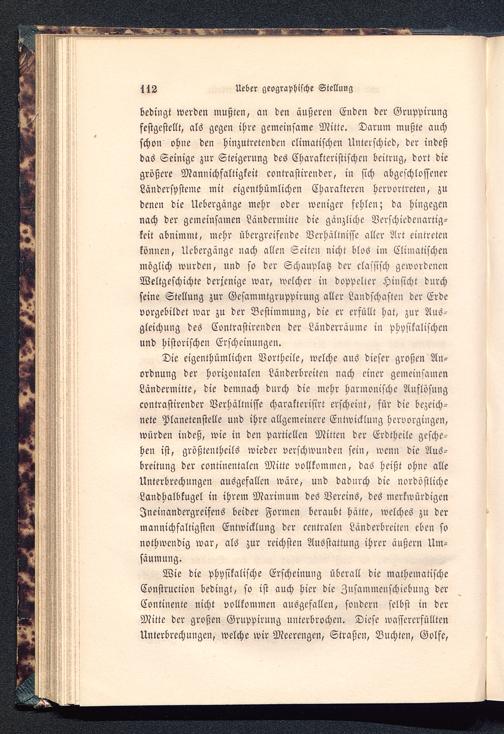 Die eigenthümlichen Vortheile, welche aus dieser großen An-ordnung der horizontalen Länderbreiten nach einer gemeinsamenLändermitte, die demnach durch die mehr harmonische Auflösungcontrastirender Verhältnisse charakterisiert erscheint, für die bezeich-nete Planetenstelle und ihre allgemeinere Entwicklung hervorgingen,würden indeß, wie in den partiellen Mitten der Erdtheile gesche-hen ist, größtenteils wieder verschwunden sein, wenn die Aus-breitung der continentalcn Mitte vollkommen, das heißt ohne alleUnterbrechungen ausgefallen wäre, und dadurch die nordöstlicheLandhalbkugel in ihrem Marimum des Vereins, des merkwürdigenJneinandergreifens beider Formen beraubt hätte, welches zu dermannichfaltigstcn Entwicklung der centralen Länderbreiten eben sonothwendig war, als zur reichsten Ausstattung ihrer äußern Uin-säumung.