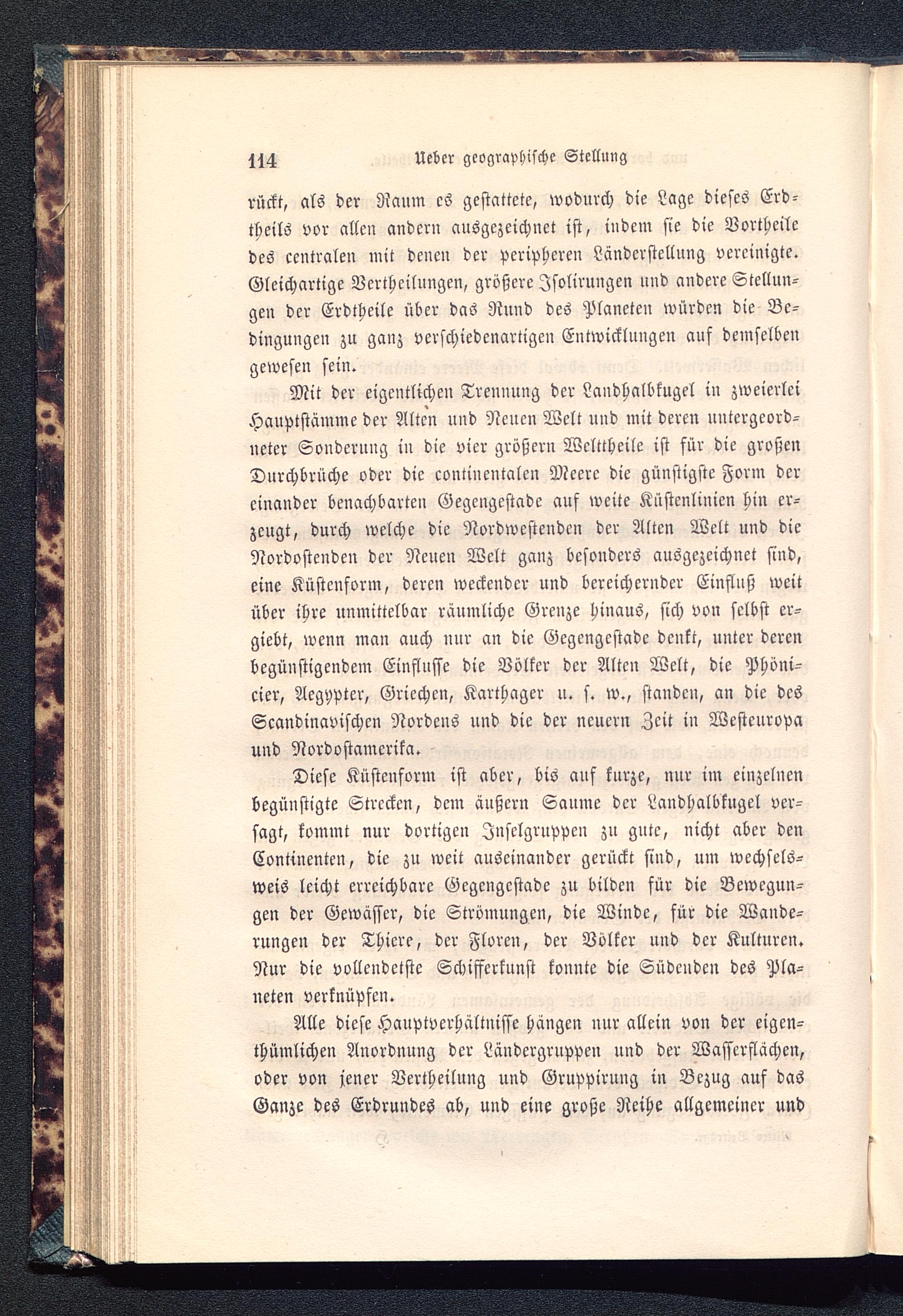 Mit der eigentlichen Trennung der Landhalbkugel iu zweierleiHauptstämme der Alten und Nencn Welt und mit deren uutergeord-netcr Sonderung in die vier größcru Wclttheile ist sür die großenDurchbrüche oder die continentalcn Meere die günstigste Form dereinander benachbarten Gegcngestadc auf weite Küstenlinien hin er-zeugt, durch welche die Nordwestendcn der Alten Welt und dieNordostenden der Neuen Welt ganz besonders ausgezeichnet sind,eine Küstenform, deren weckender und bereichernder Einfluß weitüber ihre unmittelbar räumliche Grenze hinaus, sich von selbst er-giebt, wenn man auch nur an die Gegengcstade denkt, unter derenbegünstigendem Einflüsse die Völker der Alten Welt, die Phöni-cier, Aegppter, Griechen, Karthager u. s. w., standen, an die desScandinavischcn Nordens und die der neuern Zeit in Westeuropa und Nordostamcrika.