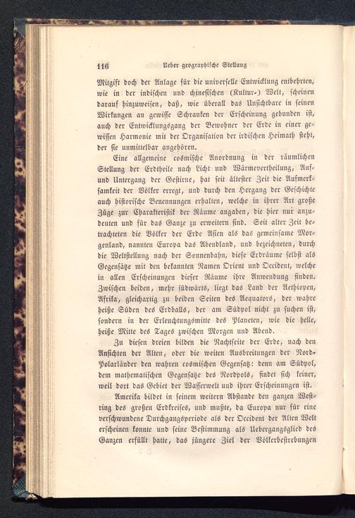 Eine allgemeine cosmischc Anordnung iu der räumlichenStellung der Erdtheile nach Licht und Wärmevertheilung, Auf-und Untergang der Gestirne, hat seit ältester Zeit die Aufmerk-samkeit der Völker erregt, und durch den Hergang der Geschichteauch historische Benennungen erhalten, welche in ihrer Art großeZüge zur Charakteristik der Räume angaben, die hier nur anzu-deuten und für das Ganze zu erweitern sind. Seit alter Zeit be-trachteten die Völker der Erde Asien als das gemeinsame Mor-genland, nannten Europa das Abendland, und bezeichneten, durchdie Weltstellung nach der Sonnenbahn, diese Erdräume selbst alsGegensätze mit den bekannten Namen Orient und Occident, welchein allen Erscheinungen dieser Räume ihre Anwendung finden.Zwischen beiden, mehr südwärts, liegt das Land der Aethiopcn,Afrika, gleichartig zu beiden Seiten des Aequators , der wahreheiße Süden des Erdballs, der am Südpol nicht zu suchen ist,sondern in der Erleuchtungsmitte des Planeten, wie die helle,heiße Mitte des Tages zwischen Morgen und Abend.