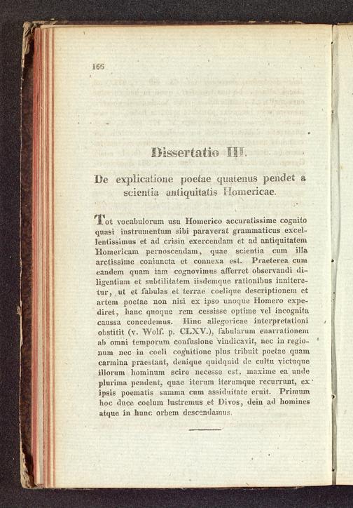 Tot vocabulorum usu Homerico accuratissime cognitoquasi instrumentum sibi paraverat grammaticus excel-lentissimus et ad crisin exercendam et ad antiquitatemHomericam pernoscendam, quae scientiaarctissime coniuncta et connexa est. Praeterea cumeandem quam iam cognovimus afferret observandi di-ligentiam et subtilitatem iisdemque rationibus innitere-tur, ut et fabulas et terrae coelique descriptionem etartem poetae non nisi ex ipso unoque Homero expe-diret, hanc quoque rem cessisse optime vel incognitacaussa concedemus. Hinc allegoricae interpretationiobstitit( v. Wolf. p. CLXV.), fabularum enarrationemab omni temporum confusione vindicavit, nec in regio-num nec in coeli cognitione plus tribuit poetae quamcarmina praestant, denique quidquid de cultu victuqueillorum hominum scire necesse est, maxime ea undeplurima pendent, quae iterum iterumque recurrunt, exipsis poematis summa cum assiduitate eruit. Primumhoc duce coelum lustremus et Divos, dein ad hominesatque in hunc orbem descendamus.