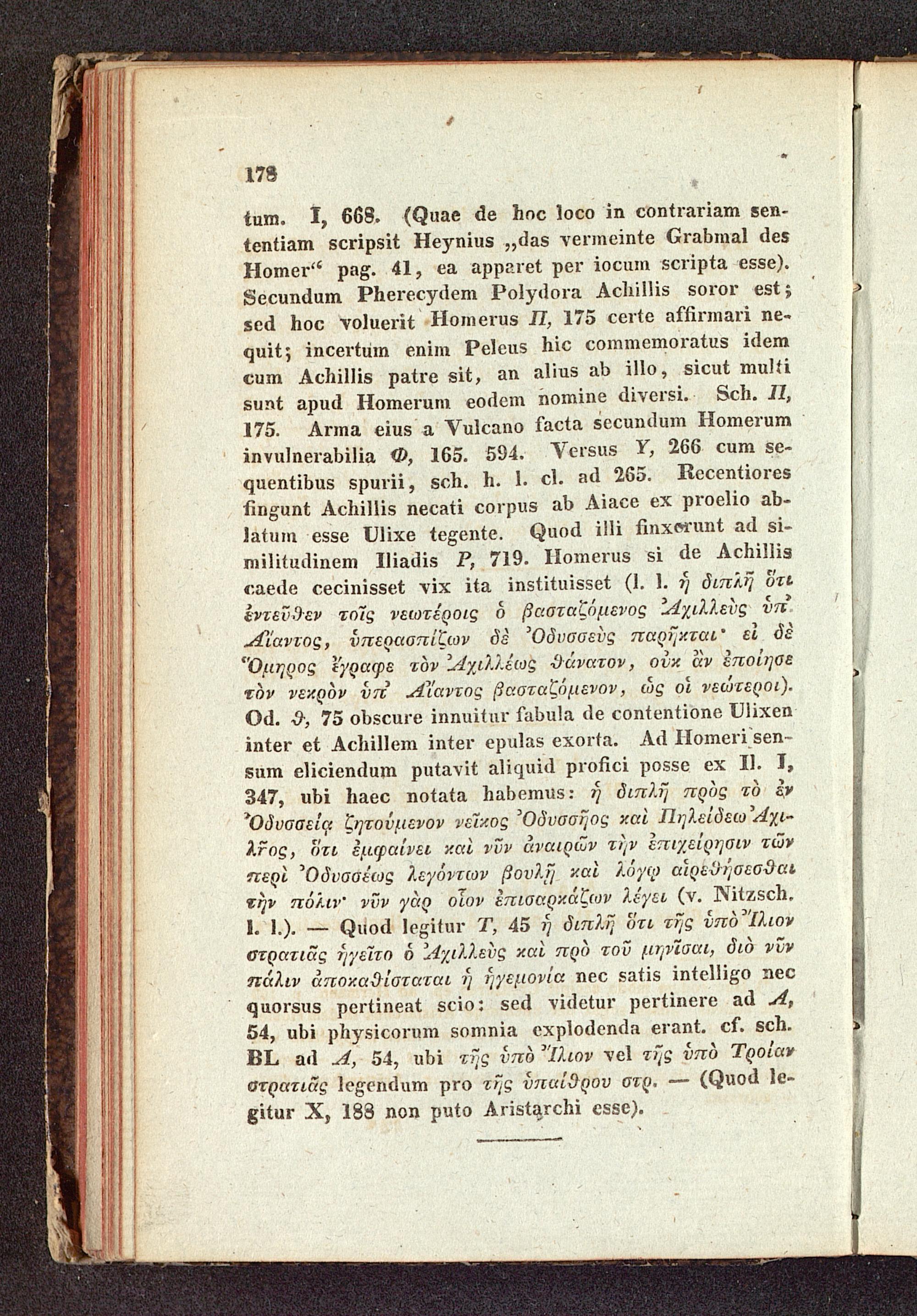 tum. I, 668.( Quae de hoc loco in contrariam sen-tentiam scripsit Heynius ,, das vermeinte Grabmal desHomer" pag. 41, ea apparet per iocum scripta esse).Secundum Pherecydem Polydora Achillis soror est;sed hoc voluerit Homerus II, 175 certe affirmari ne-quit; incertum enim Peleus hic commemoratus idemcum Achillis patre sit, an alius ab illo, sicut multisunt apud Homerum eodem nomine diversi. Sch. II,175. Arma eius a Vulcano facta secundum Homeruminvulnerabilia Φ, 165. 594. Versus Y, 266 cum se-quentibus spurii, sch. h. I. cl. ad 265. Recentioresfingunt Achillis necati corpus ab Aiace ex proelio ab-latum esse Ulixe tegente. Quod illi finxerunt ad si-militudinem Iliadis P, 719. Homerus si de Achilliscaede cecinisset vix ita instituisset( 1. 1. ἡ διπλῆ ὅτιἐντεῦθεν τοῖς νεωτέροις ὁ βασταζόμενος Αχιλλεὺς ὑπΑίαντος, ὑπερασπίζων δὲ Ὀδυσσεὺς παρῆκται · εἰ δὲὍμηρος ἔγραφε τὸν ᾿Αχιλλέως θάνατον, οὐκ ἂν ἐποίησετὸν νεκρὸν ὑπ᾿ Αἴαντος βασταζόμενον, ὡς οἱ νεώτεροι).Od. 9, 75 obscure innuitur fabula de contentione Ulixen-inter et Achillem inter epulas exorta. Ad Homeri sen-sum eliciendum putavit aliquid profici posse ex Il. I,347, ubi haec notata habemus: ἡ διπλῆ πρὸς τὸ ἐνΟδυσσείᾳ ζητούμενον νεῖκος Ὀδυσσῆος καὶ Πηλείδεω Αχιλος, ὅτι ἐμφαίνει καὶ νῦν ἀναιρῶν τὴν ἐπιχείρησιν τῶνπερὶ Ὀδυσσέως λεγόντων βουλῇ καὶ λόγῳ αἱρεθήσεσθαιτὴν πόλιν · νῦν γὰρ οἷον ἐπισαρκάζων λέγει( v. Witzsch.Quod legitur T, 45 ἡ διπλῆ ὅτι τῆς ὑπὸ Ἴλιονστρατιᾶς ἡγεῖτο ὁ ᾿Αχιλλεὺς καὶ πρὸ τοῦ μηνῖσαι, διὸ νῦνπάλιν ἀποκαθίσταται ἡ ἡγεμονία nec satis intelligo necquorsus pertineat scio: sed videtur pertinere ad A,54, ubi physicorum somnia explodenda erant. cf. sch.BL ad 4, 54, ubi τῆς ὑπὸ Ἴλιον vel τῆς ὑπὸ Τροίανστρατιᾶς legendum pro τῆς ὑπαίθρου στρ.-( Quod lemgitur X, 183 non puto Aristarchi esse).