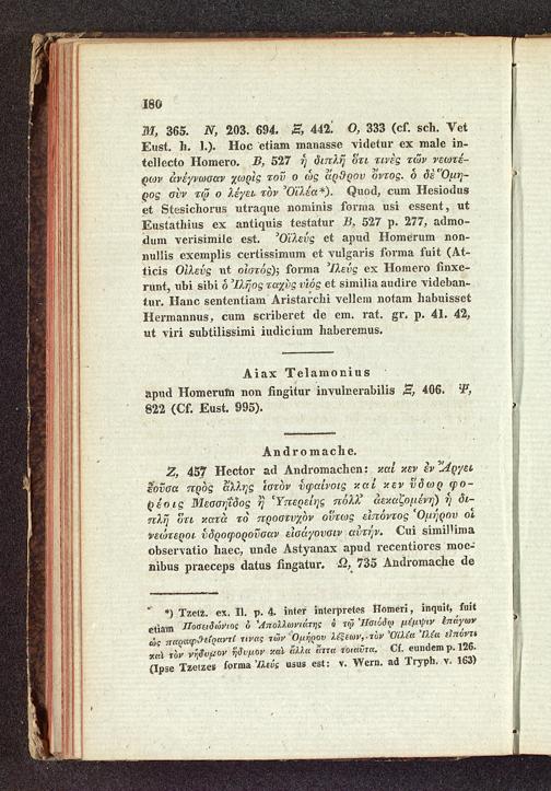 m, 365. N, 203. 694. Ξ, 442.0, 333( cf. sch. VetEust. h. 1.). Hoc etiam manasse videtur ex male in-tellecto Homero. B, 527 ἡ διπλῆ ὅτι τινὲς τῶν νεωτέ-ρων ἀνέγνωσαν χωρὶς τοῦ ο ὡς ἄρθρου ὄντος. ὁ δὲ Ὅμη-φος σὺν τῷ ο λέγει τὸν Ὀϊλέα*). Quod, cum Hesioduset Stesichorus utraque nominis forma usi essent, utEustathius ex antiquis testatur B, 527 p. 277, admo-dum verisimile est. Οϊλεύς et apud Homerum non-nullis exemplis certissimum et vulgaris forma fuit( At-ticis Oἰλεύς ut οἶστός); forma Ιλεύς ex Homero finxe-runt, ubi sibi ὁ Ἰλῆος ταχὺς υἱός et similia audire videban-tur. Hanc sententiam Aristarchi vellem notam habuissetHermannus, cum scriberet de em. rat. gr. p. 41. 42,ut viri subtilissimi iudicium haberemus.