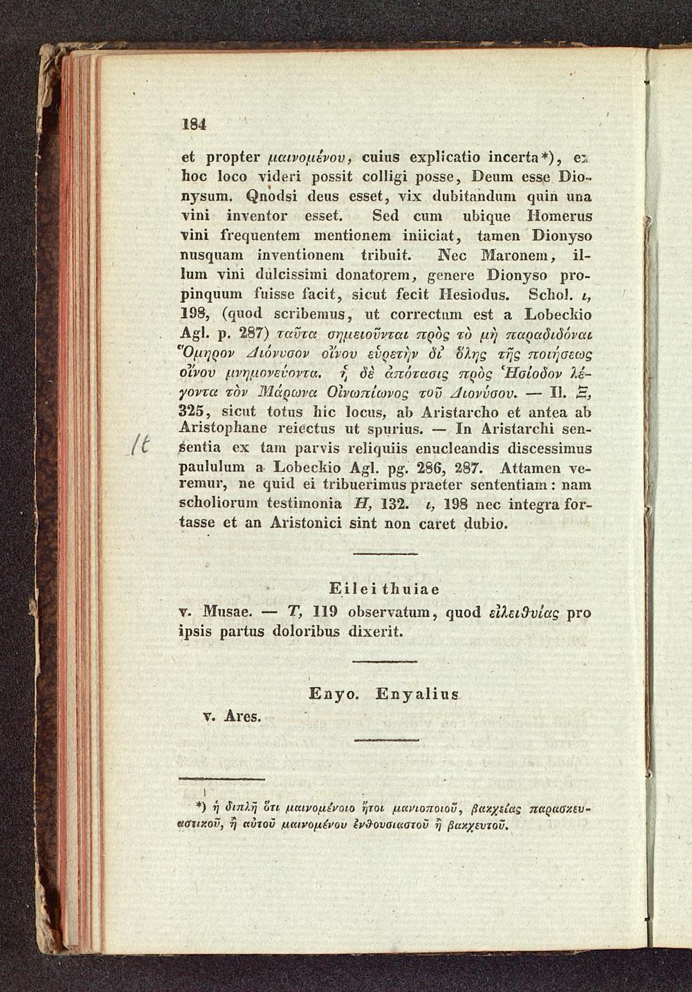 et propter uavouévov, cuius explicatio incerta*), exhoc loco videri possit colligi posse, Deum esse Dio-nysum. Qnodsi deus esset, vix dubitandum quin unavini inventor esset. Sed cum ubique Homerusvini frequentem mentionem iniiciat, tamen Dionysonusquam inventionem tribuit. Nec Maronem, il-lum vini dulcissimi donatorem, genere Dionyso pro-pinquum fuisse facit, sicut fecit Hesiodus. Schol.,198,( quod scribemus, ut correctum est a LobeckioAgl. p. 287) ταῦτα σημειοῦνται πρὸς τὸ μὴ παραδιδόναιὍμηρον Διόνυσον οἴνου εὑρετὴν δι᾽ ὅλης τῆς ποιήσεωςοἴνου μνημονεύοντα. ἡ δὲ ἀπότασις πρὸς Ἡσίοδον λέ-γοντα τὸν Μάρωνα Οἰνωπίωνος τοῦ Διονύσου. – 11. Ξ,325, sicut totus hic locus, ab Aristarcho et antea abAristophane reiectus ut spurius.- In Aristarchi sen-sentia ex tam parvis reliquiis enucleandis discessimuspaululum a Lobeckio Agl. pg. 286, 287. Attamen ve-remur, ne quid ei tribuerimus praeter sententiam: namscholiorum testimonia H, 132., 198 nec integra for-tasse et an Aristonici sint non caret dubio.