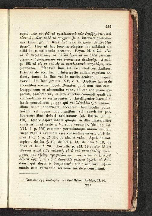 cepto„ ὡς οὐ δεῖ τὰ σχετλιαστικὰ τῶν ἐπιῤῥημάτων καὶεὐκτικά, οἷον οὐδὲ τὰ βακχικὰ( h. e. interiectiones om-nes Dion. gr. p. 642) ὑπὸ τὴν ἔντεχνον ἀκολουθίανἄγειν“. Hoc ut hoc loco in adspiratione adhibuit sicalibi in constituendo accentu. Etym. M. s. ἰώ. εἶτατὸ ὦ περισπᾶται, τὸ δὲ ἰύ ὀξύνεται ἀλλὰ σχετλια-στικὸν καὶ βακχευτικὸν οὐχ ὑποπίπτει ἀναλογίᾳ. Arcad.p. 183 τὰ εἰς οι καὶ εἰς αι σχετλιαστικὰ παραλόγως πε-ρισπῶνται. Manavit hoc ad Grammaticos Latinos.Priscian de acc. fin. ,, Interiectio nullam regulam re-tinet, tamen in fine vel in medio acuitur, ut papae,evax". Id. Inst. gramm. XV, c. 7. ,, Optime tamen deaccentibus eorum docuit Donatus quod non sunt certi.Quippe cum et abscondita voce, id est non plane ex-pressa, proferantur, et pro affectus commoti qualitateconfundantur in eis accentus". Intelligenter haec dicifacile concedimus quippe qui vel Απολλον*) et δέσποταillum suum abnormem accentum homunculis poten-tiorum vel opem implorantibus vel saevitiam per-horrescentibus deberi arbitramur( cf. Buttm. gr. p.179). Quare aspirationem quoque in illis ,, naturalitereffutitiis", ut scite a Varrone vocantur,( de ling. lat.VII, 5 p. 369) commoto perturbatoque animo debitamsaepe regulis exemtam esse consentaneum est. cf. Pris-cian I c. 5 p. 25 Kr. de aha et vaha. Apul. de not.aspirat. de ha§. 10, de hei§. 14, de hem§. 16, deheus et heu§. 20. Eustath. p. 855, 19 ἰστέον δὲ ὅτιεὕρηται παρὰ τοῖς παλαιοῖς τὸ ὦ καὶ μετὰ δασέως πνεύ-ματος καὶ ὀξείας προφερόμενον. καὶ κεῖται ἐν ἐπιλογῇλέξεων ἀρχαίᾳ, ὅτι ἅ ἅ δασυνθὲν γέλωτα δηλοῖ. cf. Sui-dam, qui docet ἁ θαυμαστικὸν etiam aspirari. Quaeomnia cum vernaculo sermone mirifice conspirant.
