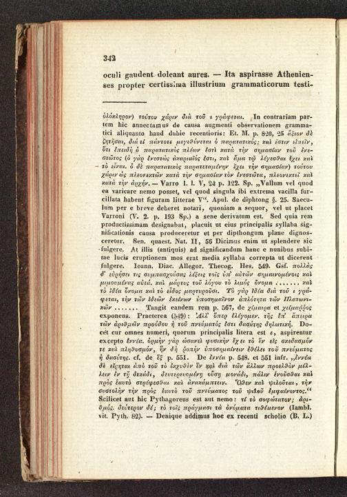 oXoxXrjnov) tovtov yccQtv Sict tov i yodcpeTai. In contrariam par-tem hic annectamus de causa augmenti observationem gramma-tici aliquanto haud dubie recentioris: Et. M. p. 8-20, '25 a^tov SkCi]irjOut, SiiciC niivioie ueye&vveitti 6 nccnctTccTiy.os; xul iaxiv tineTv,oti inttSi) 6 nuQuiuny.bs nXecov iori xcticc t!jv or\fxua(uv tov ive-aimios (o yuQ iveonbs uxccqiuTos Ioti, xul a/xu tco XiyeaOcct fyet xai- to tivcci. 6 Se nuQuTUTixbs nctnctieinfiivijv iyet ir)v ar\fcaa(av) tovtovyctniv cbs nXeovexitov xaiu tj)v Or]fitta(uv ibv iveaicoTct, nXeovexieT. xa\xaiu ti)v uQyJiv, — Varro 1. 1. V, 24 p. 122. Sp. „Vallum vel quodea varicare nemo posset, vel quod singula ibi extrema vacilla fur-cillata habent figuram litterae V". Apul. de diphtong §. 25. Saecu-lum per e breve deberet notari, quoniam a sequor, vel ut placetVarroni (V. 2. p. 193 Sp.) a sene derivatum est. Sed quia remproductissimam designabat, placuit ut eius principalis syllaba sig-niiicationis causa produceretur et per dipthongum plane dignos-ceretur, Sen. quaest. Nat. II, 56 Dicimus enim ut splendere sic•fulgere, At illis (antiquis) ad significandum hanc e nunibus subi-tae lucis eruptionem mos erat media syllaba correpta ut dicerentfulgere. Ioann. Diac. Allegor. Thecog. Hes. 549. Gsf. noXXccscf tvQ^aet tis avftnccayovaug Xiitts tois in ccvicov aijftatvoftivois xal