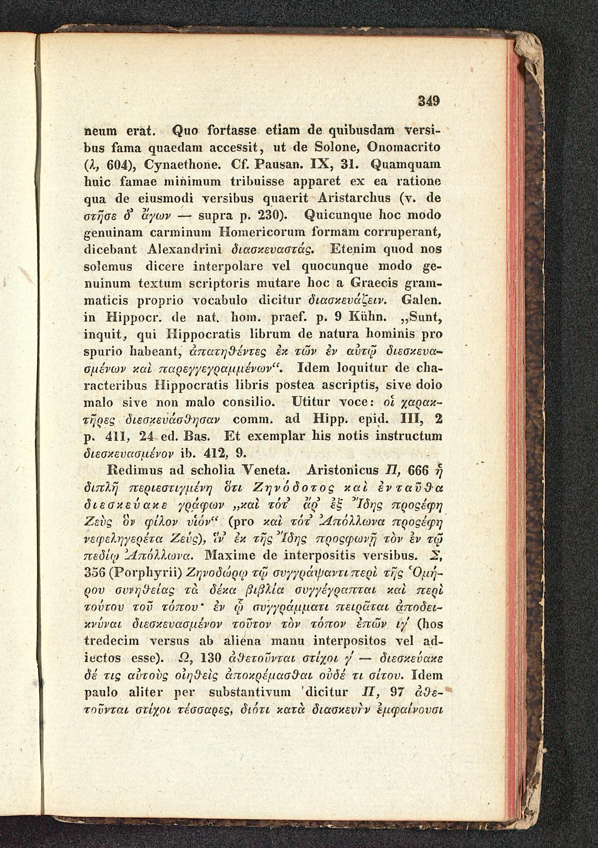 neum erat. Quo fortasse etiam de quibusdam versi-bus fama quaedam accessit, ut de Solone, Onomacrito( λ, 604), Cynaethone. Cf. Pausan. IX, 31. Quamquamhuic famae minimum tribuisse apparet ex ea rationequa de eiusmodi versibus quaerit Aristarchus( v. deστῆσε δ᾽ ἄγωνsupra p. 230). Quicunque hoc modogenuinam carminum Homericorum formam corruperant,dicebant Alexandrini διασκευαστάς. Etenim quod nossolemus dicere interpolare vel quocunque modo ge-nuinum textum scriptoris mutare hoc a Graecis gram-maticis proprio vocabulo dicitur διασκευάζειν. Galen.in Hippocr. de nat. hom. praef. p. 9 Kühn. ,, Sunt,inquit, qui Hippocratis librum de natura hominis prospurio habeant, ἀπατηθέντες ἐκ τῶν ἐν αὐτῷ διεσκευα-σμένων καὶ παρεγγεγραμμένων“. Idem loquitur de cha-racteribus Hippocratis libris postea ascriptis, sive doiomalo sive non malo consilio. Utitur voce: οἱ χαρακ-τῆρες διεσκευάσθησαν comm. ad Hipp. epid. III, 2p. 411, 24 ed. Bas. Et exemplar his notis instructum