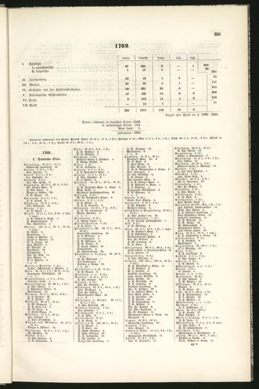 Auswärts erschienene 114 Werke: Protest. Thevl. IS (S l., il d., l fr.); Jurispr. 2 (d.); Me», 5 (> l., 3 d., i fr.); Gesch. SO (4 d., 14 fr., 2 it.); Philof(13 l., i» »., 21 fr., l it.); Poesie S8 (7 d., 20 fr., 1 it.).