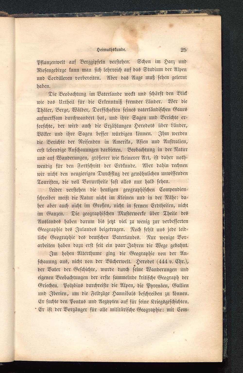 Im hohen Alterthume ging die Geographie von der An-schauung aus, nicht von der Bücherwelt. Herodot (444 v. Chr.),der Vater der Geschichte, wurde durch seine Wanderungen undeigenen Beobachtungen der erste sammelnde kritische Geograph derGriechen. Polhbius durchreiste die Alpeu, die Pyrenäen, Gallien und Iberien, um die Feldzüge Hannibals beschreiben zu können.Er suchte den Pontus und Aegypten ans für seine Kriegsgeschichten.Er ist der Vorgänger für alle militärische Geographie: mit Com-