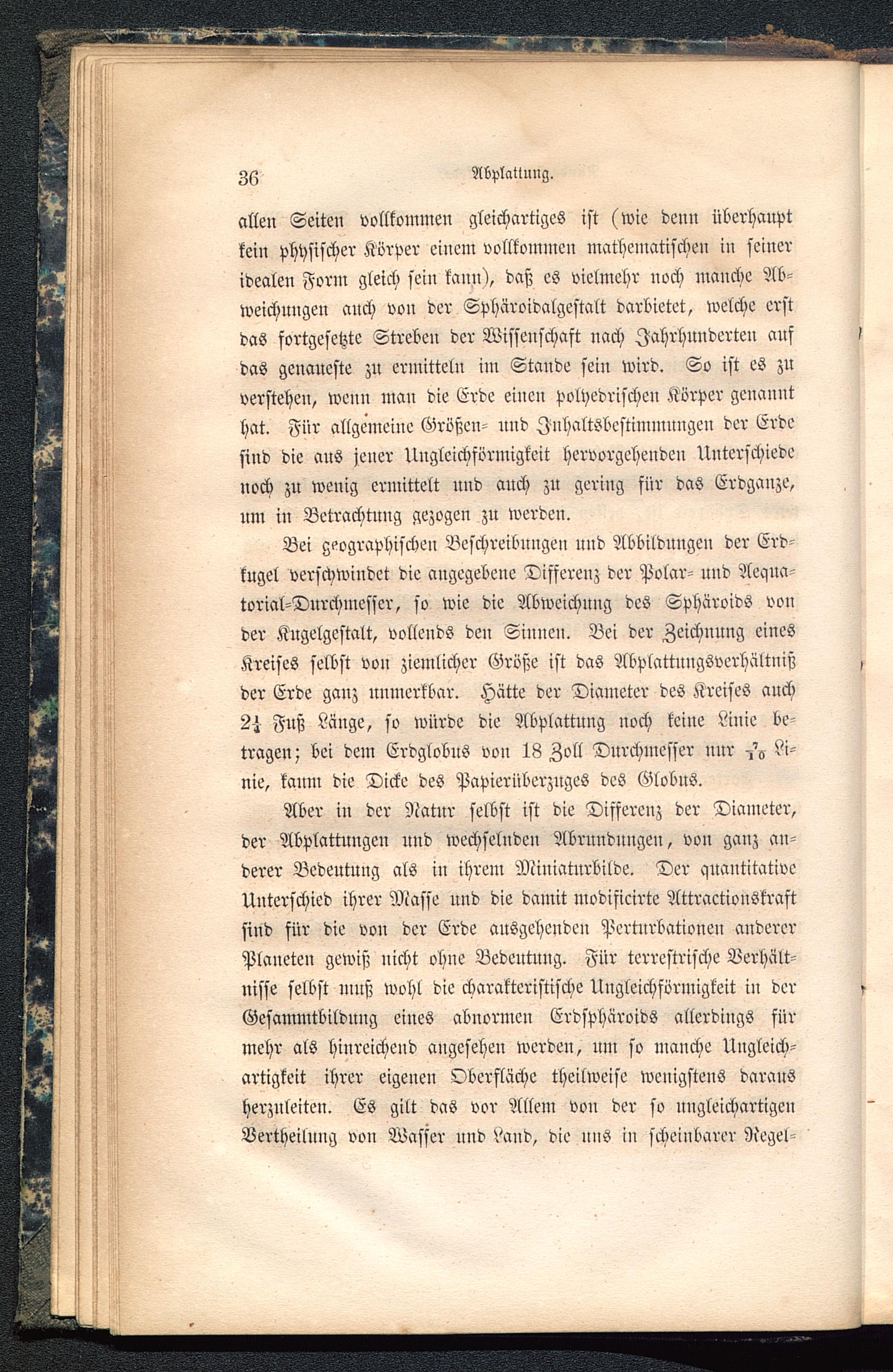 allen Seiten vollkommen gleichartiges ist (wie denn überhauptkein physischer Körper einem vollkommen mathematischen in seineridealen Form gleich sein kann), daß es vielmehr noch manche Ab-weichungen auch vou der Sphäroidalgestalt darbietet, welche erstdas fortgesetzte Streben der Wissenschaft nach Jahrhunderten aufdas genaueste zu ermitteln im Stande sein wird. So ist es zuverstehen, wenn man die Erde einen polyedrischen Körper genannthat. Für allgemeine Größen- und Inhaltsbestimmungen der Erdesind die aus jener Unglcichförmigkeit hervorgehende» Unterschiedenoch zu wenig ermittelt und auch zu gering für das Erdganze,um in Betrachtung gezogen zu werden.