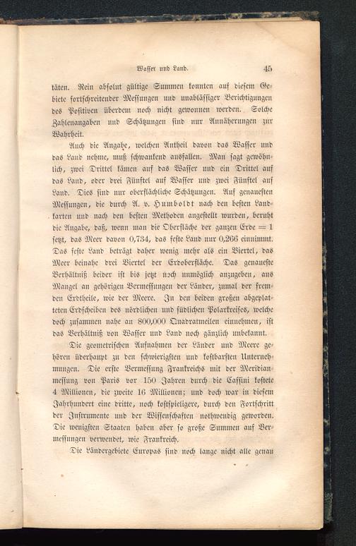 Anch die Angabe, welchen Antheil davon das Wasser unddas Land nehme, muß schwankend ausfällen. Man sagt gewöhn-lich, zwei Drittel käme» auf das Wasser und ein Drittel aufdas Land, oder drei fünftel auf Wasser und zwei Fünftel aufLand. Dies sind nnr oberflächliche Schätzungen. Auf genauestenMessuugcu, die durch A. v. Humboldt nach den besten Land-karten nnd nach den besten Methodeu angestellt wurden, beruhtdie Augabe, daß, wenn mau die Oberfläche der ganzen Erde — 1setzt, das Meer davon 9,734, das feste Land nur 0,266 einnimmt.Das feste Land beträgt daher wenig mehr als eiu Viertel, dasMeer beinahe drei Viertel der Erdoberfläche. Das genauesteVerhältniß beider ist bis jetzt Noch unmöglich anzugeben, ausMaugel an gehörigen Vermessungen der Länder, zumal der frem-den Erdtheile, wie der Meere. In den beiden großen abgeplat-teten Erdscheiben des nördlichen uud südliche»? Polarkreises, welchedoch zusammcu nahe an 800,000 Qnadrarmeilen einnehmen, istdas Verhältniß von Wasser und Land noch gänzlich unbekannt.