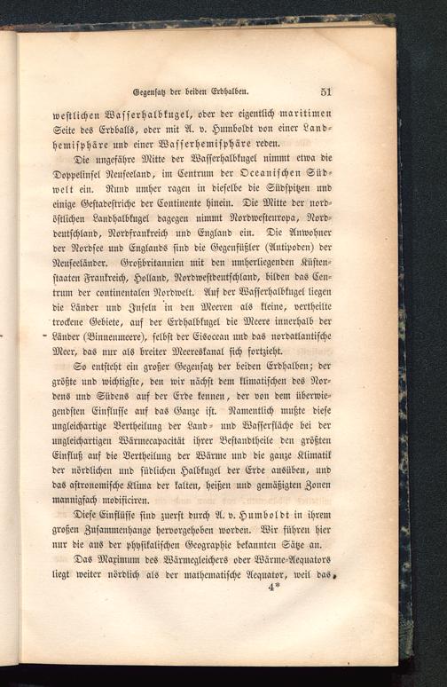 Die ungefähre Mitte der Wasserhalbkugel nimmt etwa dieDoppelinsel Neuseeland , im Centrum der Oceanischen Süd-welt ein. Rund umher ragen in dieselbe die Südspitzen undeinige Gestadestriche der Contincnte hinein. Die Mitte der nord-östlichen Landhalbkugel dagegen nimmt Nordwesteuropa , Nord-deutschland, Nordfrankreich und Eugland ein. Die Anwohnerder Nordsee und Englands sind die Gegenfüßler (Antipoden) derNeuseeländer. Großbritannien mit den umherliegenden Küsten-staaten Frankreich, Holland, Nordwestdeutschland , bilden das Cen-trum der contineutalen Nordwelt. Auf der Wasserhalbkugel liegendie Länder und Inseln in den Meeren als kleine, vertheiltetrockene Gebiete, auf der Erdhalbkugel die Meere innerhalb derLänder (Binnenmeere), selbst der Eisocean und das nordatlantischeMeer, das nur als breiter Meereskanal sich fortzieht.