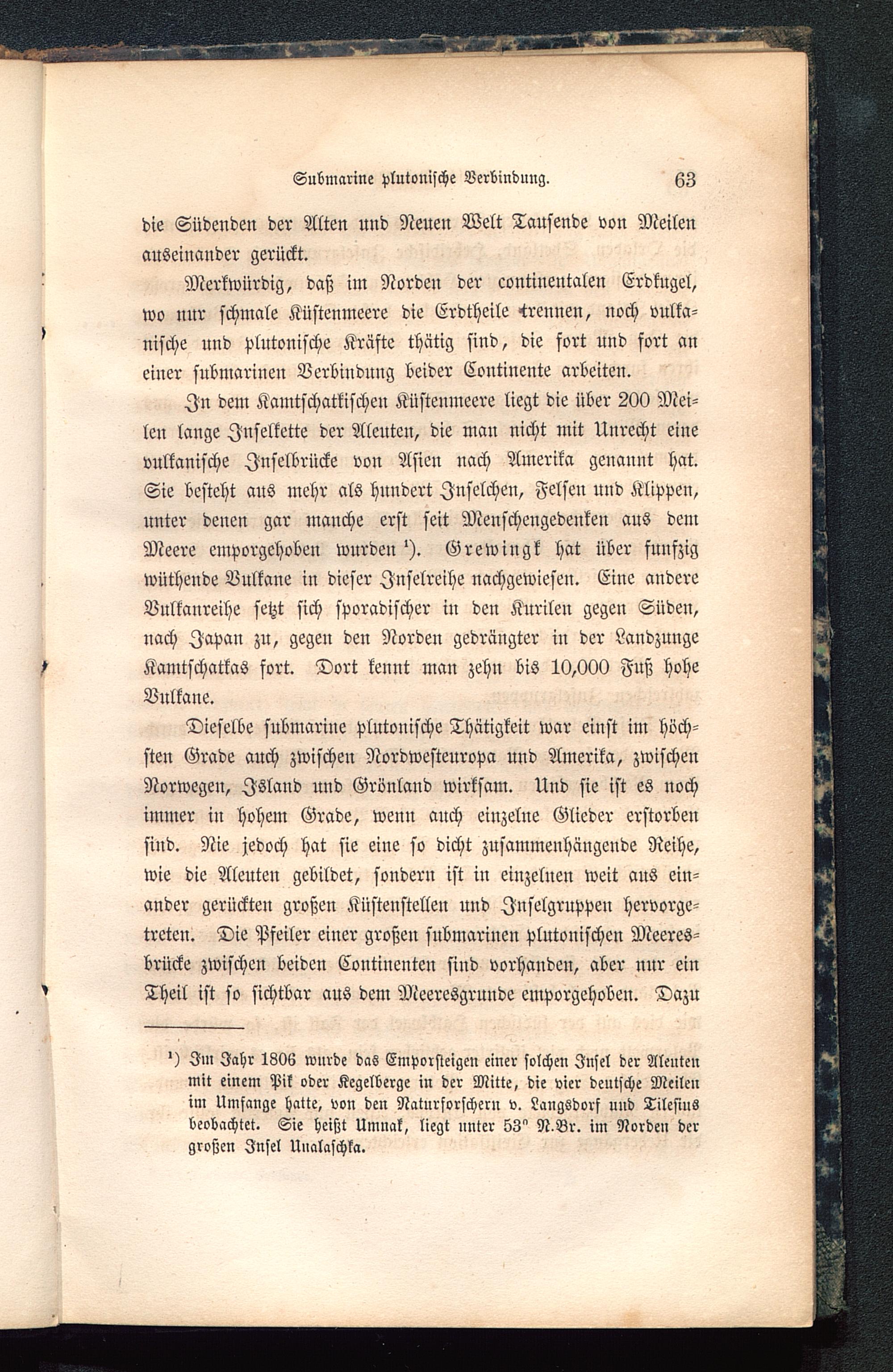 ') Im Jahr 1806 wurde das Emporsteigen einer solchen Insel der Aleutenmit einem Pik oder Kegelberge in der Mitte, die vier deutsche Meilenim Umfange hatte, von den Naturforschern v. Langsdorf und Tilesiusbeobachtet. Sie heißt Umnak, liegt unter 53" N.Br. im Norden dergroßen Insel Unalaschka.