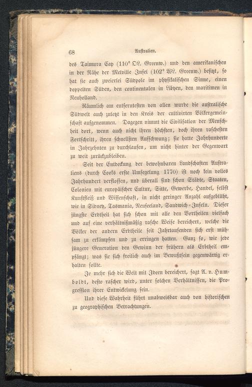 Seit der Entdeckung der bewohnbaren Landschaften Austra-liens (durch Cooks erste Umsegcluug 1770) ist noch keiu vollesJahrhundert verflossen, und überall sind schon Städte, Staaten,Colonien mit europäischer Cultur, Sitte, Gewerbe, Handel, selbstKnustfleiß und Wissenschaft, in nicht geringer Anzahl aufgeblüht,wie in Sidney, TaSmania, Neuseetand, Sandwich-Inseln. Dieserjüngste Erdtheil hat sich schon mit alle den Vortheilen vielfachund auf eine verhältnißmäßig rasche Weise bereichert, welche dieVölker der andern Erdtheile seit Jahrtausendcu sich erst müh-sam zu erkämpfen und zu erringen hatte». Ganz so, wie jedejüngere Generation den Gewinn der frühern als Erbtheil em-pfängt; was sie sich freilich auch im Bewußtsein gegenwärtig er-halten sollte. ,