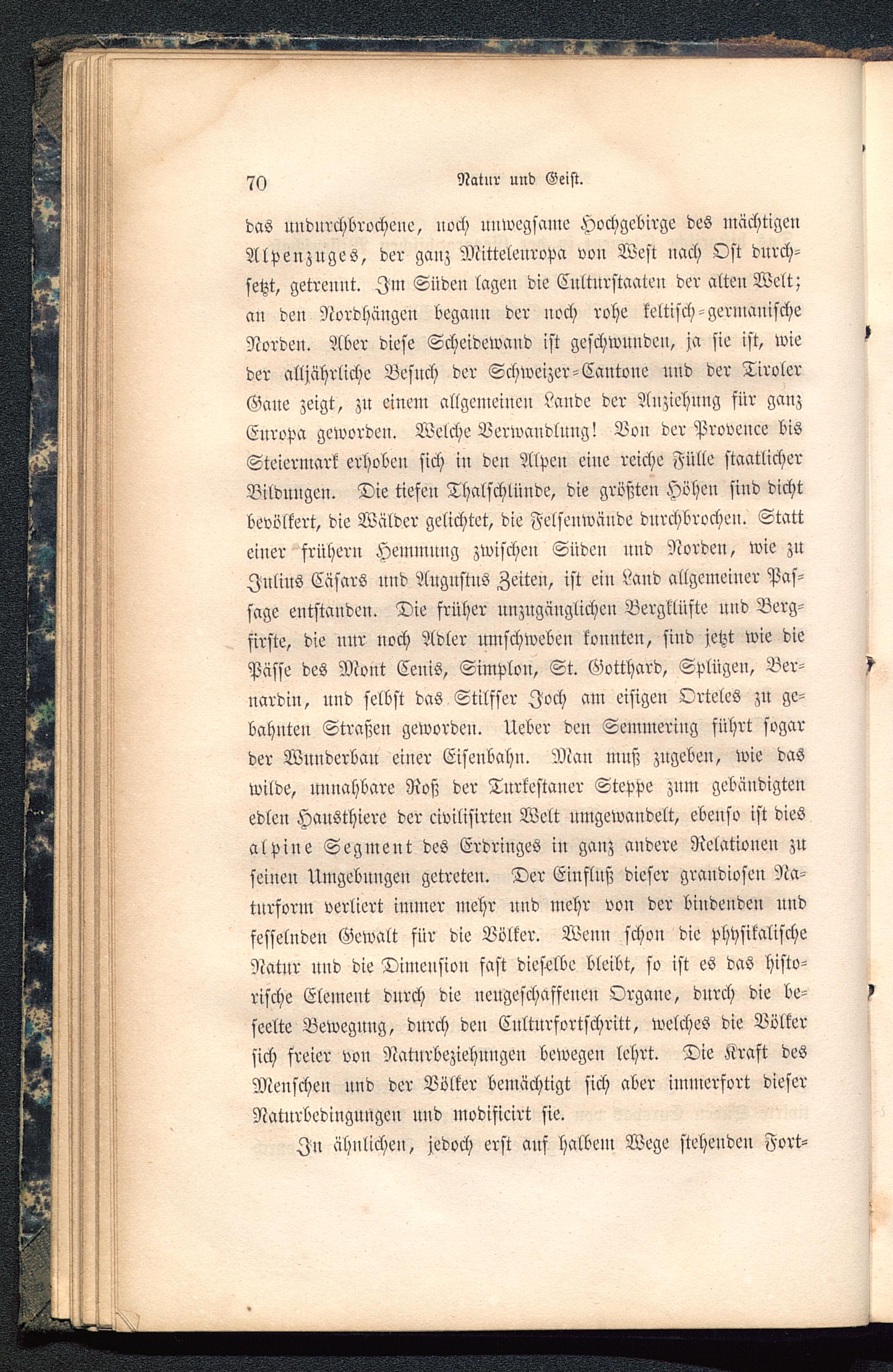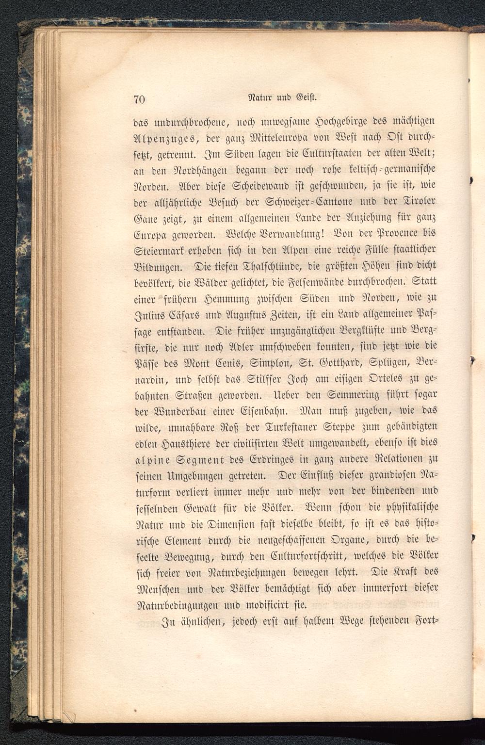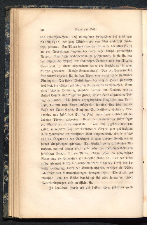 das undnrchbrochenc, noch untvegsame Hochgebirge des mächtigenAlpenzuges, der ganz Mitteleuropa von West nach Ost durch-setzt, getrennt. Im Süden lagen die Culturstaaten der alten Welt;an den Nordhängeu begann der noch rohe keltisch-germanischeNorden. Aber diese Scheidewand ist geschwunden, ja sie ist, wieder alljährliche Besuch der Schweizer -Cautone und der TirolerGane zeigt, zn einem allgemeinen Lande der Anziehung für ganzEuropa geworden. Welche Verwandlung! Von der Provence bisSteiermark erhoben sich in den Alpen eine reiche Fülle staatlicherVilduugeu. Die tiefen Thalschlünde, die größten Höhen sind dichtbevölkert, die Wälder gelichtet, die Felsenwände durchbrochen. Statteiner frühern Hemmung zwischen Süden und Norden, wie zuJulius Cäsars uud Augustus Zeiten, ist ein Land allgemeiner Pas-sage entstanden. Die früher unzugänglichen Bergklüfte uud Berg-firste, die nur noch Adler umschweben konnten, sind jetzt wie diePässe des Mont Cenis, Simplon, St. Gotthard, Splügen , Ber-nardin, und selbst das Stilfser Joch am eisigen Ortelcs zn ge-bahnten Straßen geworden. Ueber den Semmering führt sogarder Wnnderbau einer Eisenbahn. Mau muß zugeben, wie daswilde, unnahbare Roß der Turkestaner Steppe zum gebändigtenedlen Hausthiere der civilisirten Welt umgewandelt, ebenso ist diesalpine Segment des Erdringes in ganz andere Relationen zuseinen Umgebnngen getreten. Der Einfluß dieser grandiosen Na-turform verliert immer mehr und mehr von der bindenden undfesselnden Gewalt für die Völker. Wenn fchon die physikalischeNatur uud die Dimension fast dieselbe bleibt, so ist es das histo-rische Element durch die neugeschaffenen Orgaue, durch die be-seelte Bewegung, durch den Cnlturfortschritt, welches die Völkersich freier von Naturbeziehungen bewegen lehrt. Die Kraft desMenschen nnd der Völker bemächtigt sich aber immerfort dieserNaturbedingungen nnd modifieirt sie.