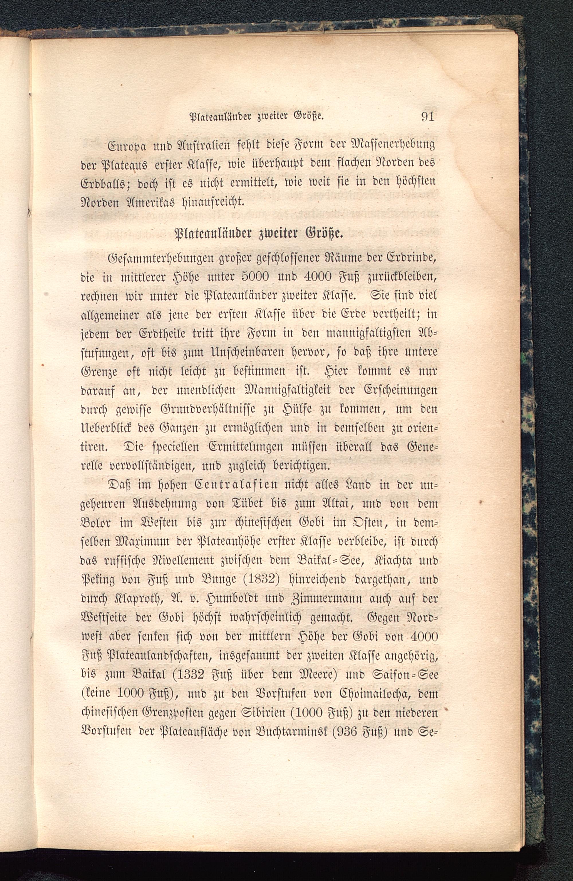 Daß im hohen Centralasien nicht alles Land in der un-geheuren Ausdehnung von Tübet bis zum Altai , und von demBolor im Westen bis zur chinesischen Gobi im Osten, in dem-selben Maximum der Plateauhöhe erster Klasse verbleibe, ist durchdas russische Nivellement zwischen dem Baikal-See, Kiachta undPeking von Fnß und Bunge (1832) hinreichend dargethan, unddurch Klaproth, A. v. Humboldt und Zimmermann auch aus derWestseite der Gobi höchst wahrscheinlich gemacht. Gegen Nord-west aber senken sich von der mittlern Höhe der Gobi von 4000Fnß Plateaulandschaften, insgesammt der zweiten Klasse angehörig,bis zum Baikal (1332 Fnß über dem Meere) und Saison-See(keine 1000 Fnß), und zu den Vorstufen von Choimailocha, demchinesischen Grenzposten gegen Sibirien (1000 Fuß) zu den niederen 'Vorstufen der Plateaufläche von Bnchtarminsk (936 Fuß) und Se-