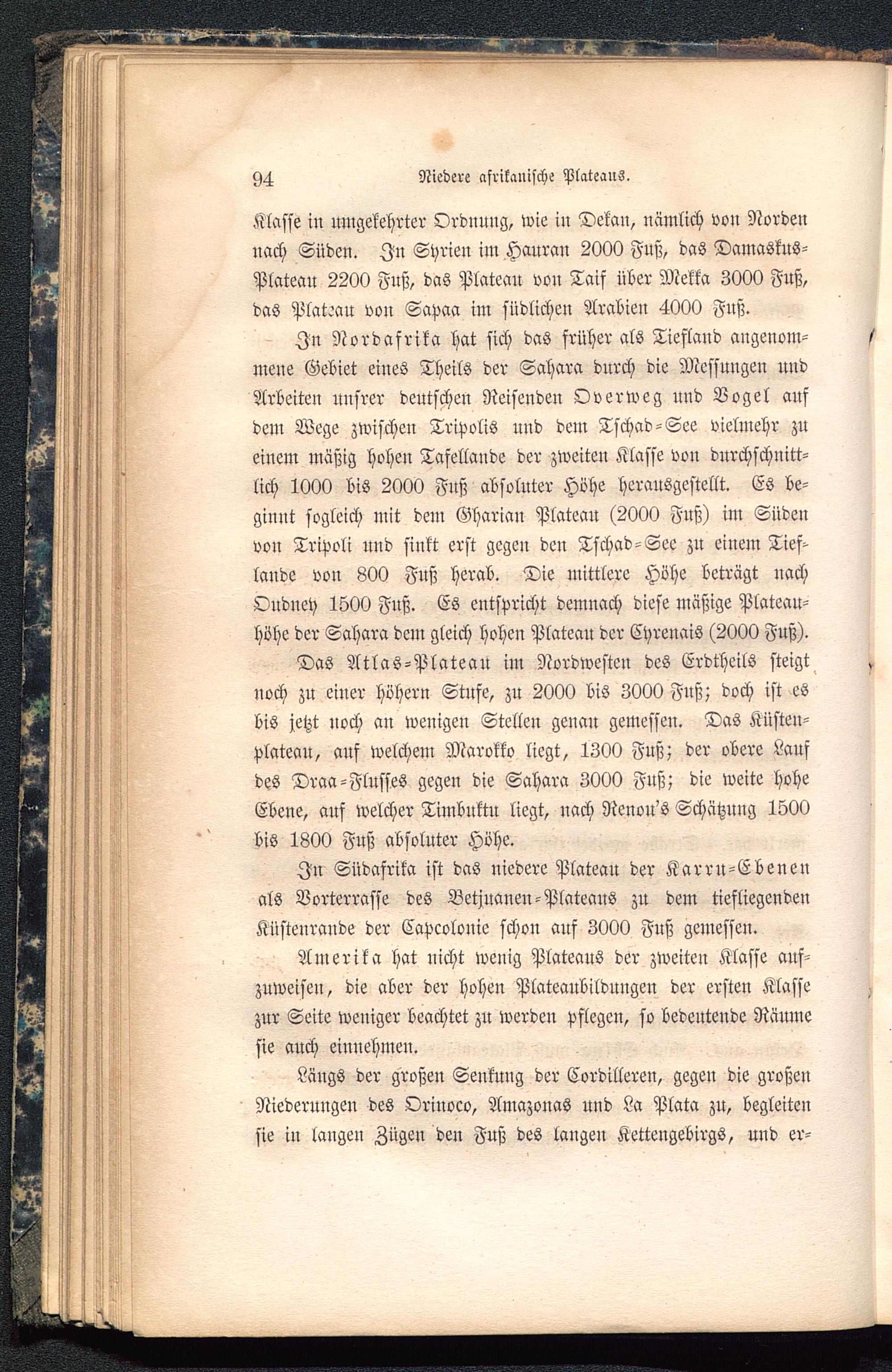 In Nordafrika hat sich das früher als Tiefland angenom-mene Gebiet eines Theils der Sahara durch die Messungen undArbeiten unsrer deutschen Reisenden Overweg und Vogel aufdem Wege zwischen Tripolis und dem Tschad-See vielmehr zueinem mäßig hohen Tafellande der zweiten Klasse von durchschnitt-lich 1000 bis 2000 Fuß absoluter Höhe herausgestellt. Es be-ginnt sogleich mit dem Gharian Plateau (2000 Fuß) im Südeuvou Tripoli und sinkt erst gegen den Tschad -See zu einem Tief-lande von 800 Fuß herab. Die mittlere Höhe beträgt uachOudney 1500 Fuß. Es entspricht demnach diese mäßige Plateau-höhe der Sahara dem gleich hohen Plateau der Chreuais (2000 Fuß).