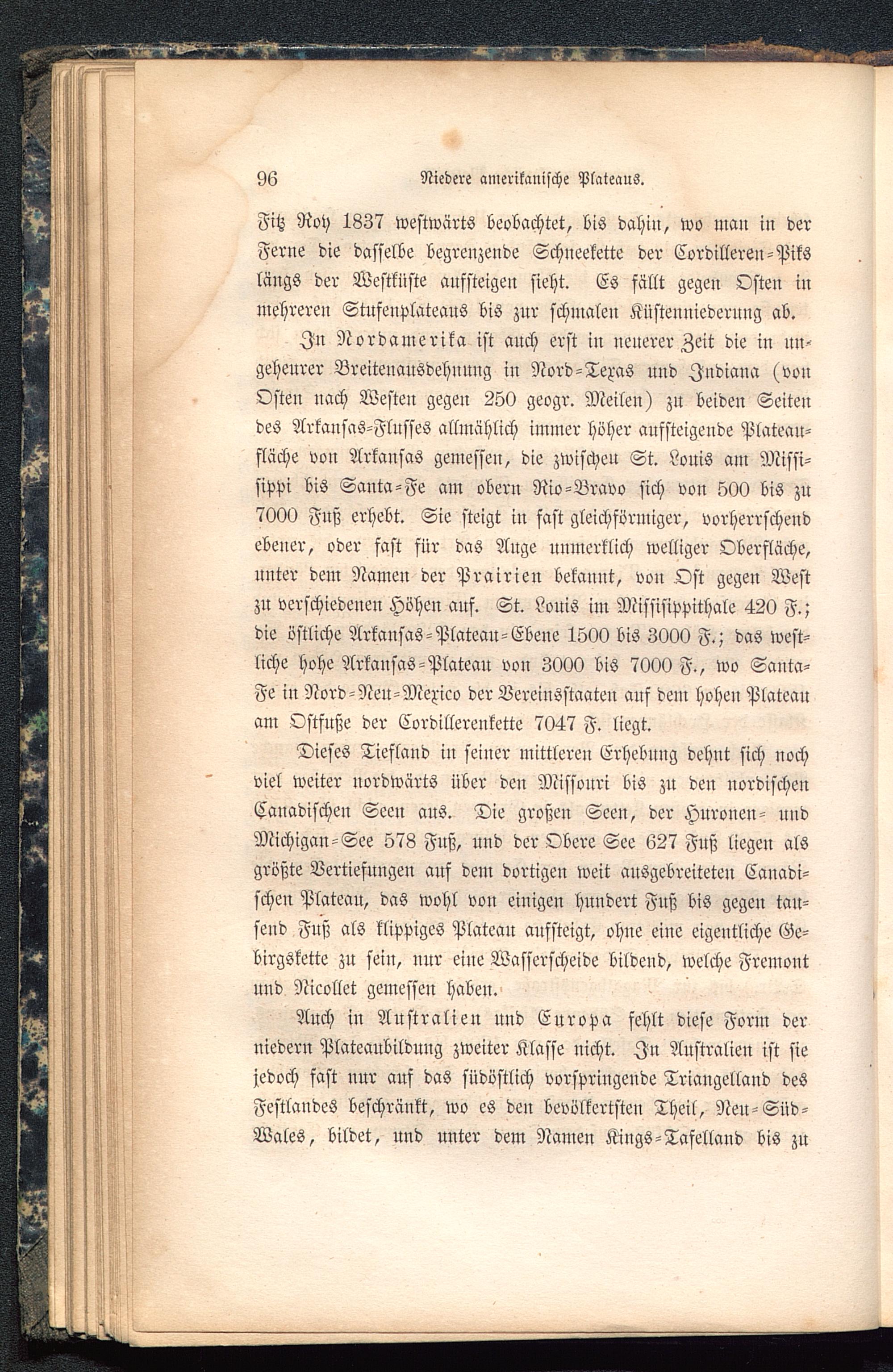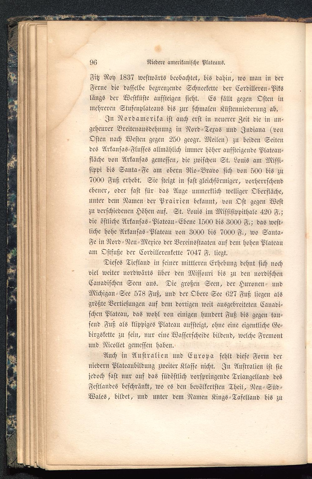 In Nordamerika ist auch erst in neuerer Zeit die in un-geheurer Breitenausdehuung in Nord-Texas und Jndiana (vonOsten nach Westen gegen 250 geogr. Meilen) zu beide» Seitendes Arkansas -Flusses allmählich immer höher aufsteigende Plateau-fläche von Arkansas gemessen, die zwischeu St. Louis am Missi-sippi bis Santa-Fe am obern Rio-Bravo sich von 500 bis zu7000 Fuß erhebt. Sie steigt iu fast gleichförmiger, vorherrschendebener, oder fast für das Auge unmerklich welliger Oberfläche,unter dem Namen der Prairien bekannt, von Ost gegen Westzu verschiedenen Höhen auf. St. Louis im Missisippithale 420 F.;die östliche Arkansas -Plateau-Ebene 1500 bis 3000 F.; das west-liche hohe Arkansas -Plateau von 3000 bis 7000 F., wo Santa-Fe iu Nord-Neu-Mexico der Vereiusstaateu auf dem hohen Plateanam Ostfuße der Cordillerenkette 7047 F. liegt.