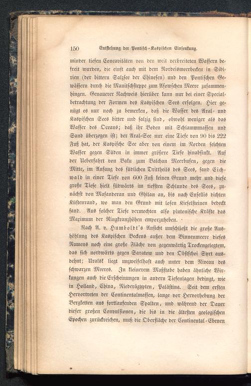 minder tiefen Concavitäten von den weit verbreiteten Wassern be-freit wurden, die einst auch mit dem Nordeismeerbecken in Sibi-rien (der bittern Salzsee der Chinesen) und den Pontischen Ge-wässern durch die Manitschsteppe zum Asowschen Meere zusammen-hingen. Genauerer Nachweis hierüber kann nur bei einer Special-betrachtnng der Formen des Kaspischen Sees erfolgen. Hier ge-nügt es nnr noch zu bemerken, daß die Wasser des Aral - undKaspischen Sees bitter und salzig sind, obwohl weniger als dasWasser des Oceans; daß ihr Boden mit Schlammmassen undSand überzogen ist; der Aral-See nnr eine Tiefe von 90 bis 222Fuß hat, der Kaspische See aber von einen', im Norden seichtenWasser gegen Süden in immer größere Tiefe hinabsinkt. Aufder Ueberfahrt von Baku zum Balchau Meerbusen, gegen dieMitte, im Anfang des südlichen Drittheils des Sees, fand Eich-wald in einer Tiefe von 600 Fuß keinen Grund mehr und diesegroße Tiefe hielt südwärts im tiefsten Schlunde des Sees, zu-nächst von Masanderan und Ghilan an, bis »ach Ensellis dichtenKüstenrand, wo man den Grund mit losen Kieselsteinen bedecktfand. Aus solcher Tiefe vermochten also Plutonische Kräfte dasMaximum der Ringkranzhöhen emporzuheben. -