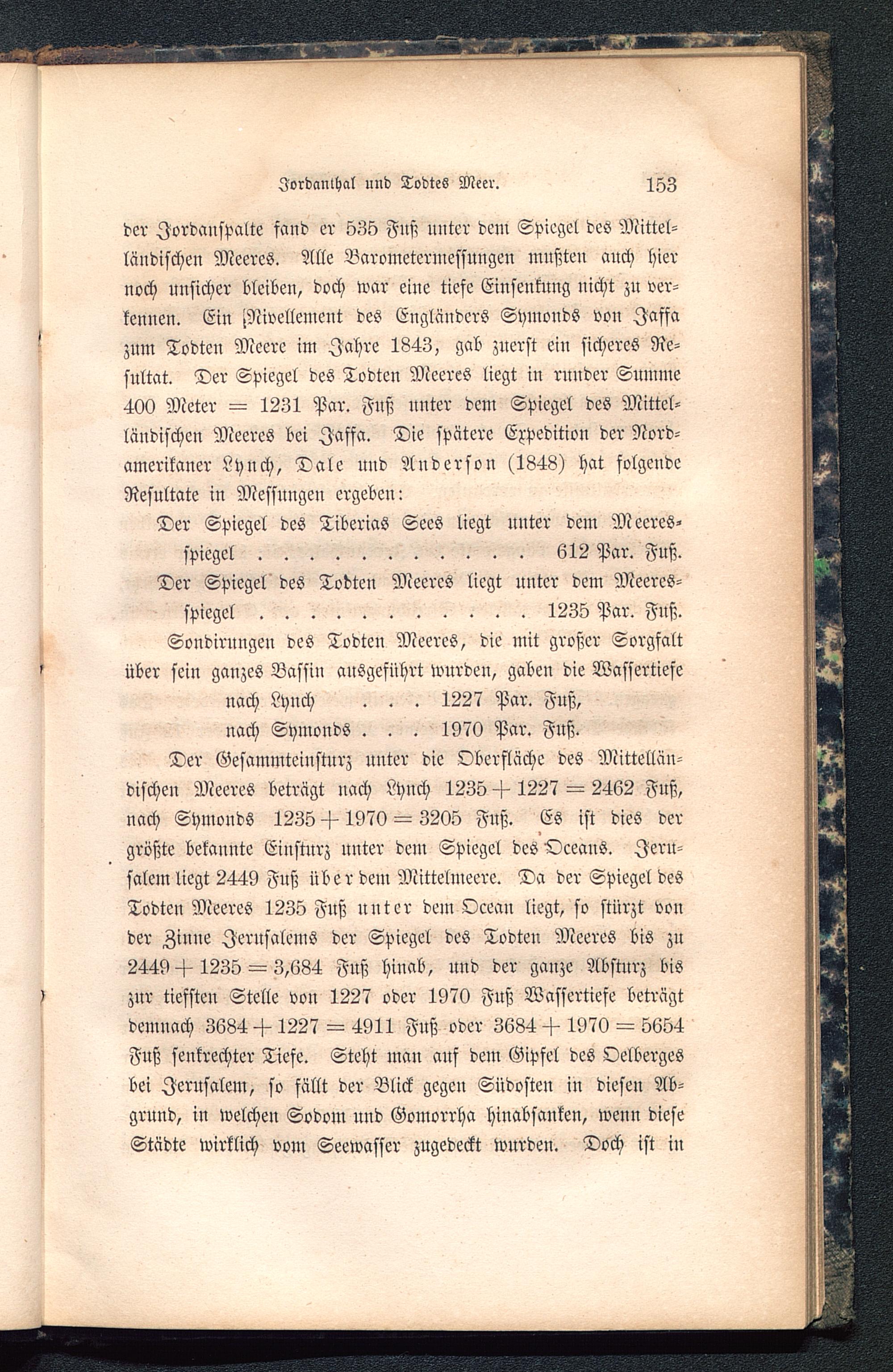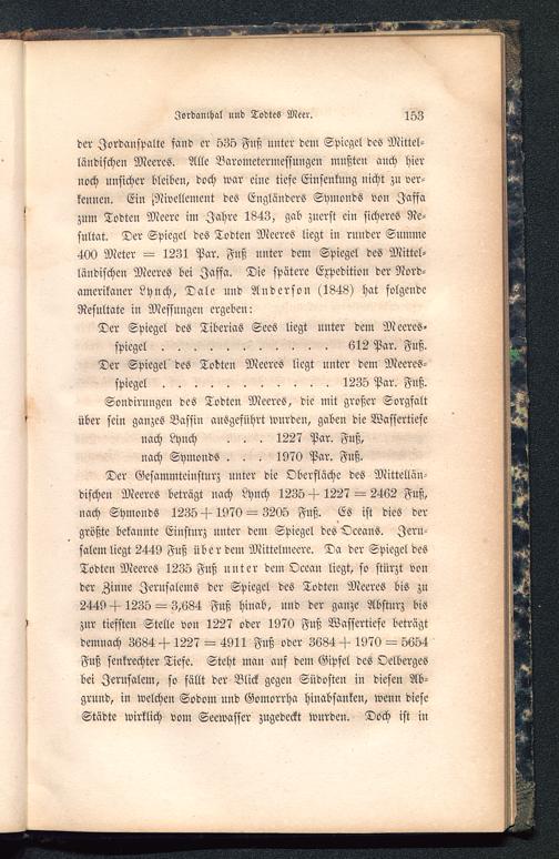Sondirungen des Todten Meeres, die mit großer Sorgfaltüber sein ganzes Bassin ausgeführt wurden, gaben die Wassertiefenach Lynch . . . 1227 Par. Fuß,nach Symonds . . . 1970 Par. Fuß.