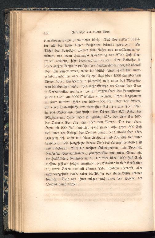 dimensionen vieles zu wünschen übrig. Das Todte Meer ist bis-her als die tiefste dieser Erdspalten bekannt geworden. DieTiefen des Kaspischen Meeres sind bisher nur unvollkommen er-mittelt, und wenn Hanwah's Sondirung von 2700 Fuß Ver-trauen verdient, sehr bedcnteud zu nennen. Der Baikalsee inseiner großen Erdspalte zwischen den steilsten Felsenufcrn, die überallüber ihm emporstarren, wird hinsichtlich seiner Tiefe für uner-gründlich gehalten, aber sein Spiegel liegt schon 1500 Fnß über demMeere, daher sein Seegrund schwerlich noch unter das Mecresni-veau hinabreichen wird. Die große Gruppe der Canadischcn Sccuin Nordamerika , von denen die fünf großen Seen des Lorenzstrom-shstems allein an 5000 lH Meilen einnehmen, liegen insgesammtin einer mittlern Höhe von 500—600 Fnß über dem Meere,auf einer Plateausläche der niedrigsten Art, die zum Theil schonin das Niederland hinabstnft: der Obere See 627 Fuß, derMichigan und Huron See fast gleich, 578, der Erie See 565,der Ontario See 232 Fuß über dem Meere. Die drei obernSeen mit 900 Fuß sondirter Tiefe stürzen also gegen 300 Fnßtief unter den Spiegel des Oceans hinab; der Ontario See aber,500 Fnß tief, reicht mit seiner Erdspalte noch 268 Fuß tief unterdenselben. Die fortgesetzte lineare Tiefe des Lorenzostrombettes istuns unbekannt. Auch die meisten Schweizerscen, wie Bodensee ,Genfersee , Vierwaldstädter-, Zürcher-See und andre Seen, wie,die Hallstädter, Gmündcr u. a., die öfter über 1000 Fuß Tiefemessen, gehören solchen Einstürzen der Erdrinde iu tiefe Erdspaltenan, deren Boden nur mit dünnen Schnttschichten überdeckt, abernicht ^ ausgefüllt ward, daher die Wasser von ihnen Besitz nehmenkonnten. Viele von ihnen mögen auch unter den Spiegel desOceans hinab reichen.