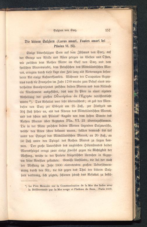 Einige bittersalzigen Seen auf dem Isthmus von Suez, aufder Grenze von Afrika und Asien gelegen im Westen und Osten,wie zwischen dem Rothen Meere im Golf von Suez und demsyrischen Mecreswinkel, dem Pelusischen des Mittelländischen Mee-res, erregten durch diese Lage eine Zeit lang als Niederungen beson-derer Art einige Aufmerksamkeit. Während der Occupatiou Aegpvtens durch die Franzosen im Jahr 1799 wnrde zum Behuf eines wie-derholten Kanalprojectes zwischen beiden Meeren und dem Nillaufeein Nivellement ausgeführt, das vou Le Ptzre in einer eigenenAbtheilung der großen Ovsoription cls l'U^pts veröffentlichtwurde Das Resultat war sehr überraschend; es gab den Meer^busen von Suez zur Ebbezeit um 25 Fuß, zur Fluthzeit um304 Fuß höher au, als das Niveau des Mittelländischen Meeres,und das schien mit Plinius ' Angabe von den: hohen Stande desRothen Meeres über Aegypten ?Iin. VI. 23 übereinzustimmen.Die in der Mitte zwischen beiden Meeren liegenden Salzmoräste,welche den Alten schon bekannt waren, sollten demnach bis tiesunter den Spiegel des Mittelländischen Meeres, an 20 Fuß, an50 Fuß unter den Spiegel des Rothen Meeres zu liegen kom-men. Der große Unterschied des ungleichen Höhenstandes beiderMeeresspiegel erregt zwar einige Zweifel gegen die Richtigkeit derMessung, welche iu der Periode kriegerischer Unruhen in Aegyp-ten keine Revision gestattete. Gewisse Umstände, die bei der nachder Messung im Jahr 1800 eintretenden großen Überschwem-mung durch den Nil, die bis gegen das Thal der bittern Salz-seen vordrang, sich zeigten, schienen jedoch das Resultat zu bestä-
