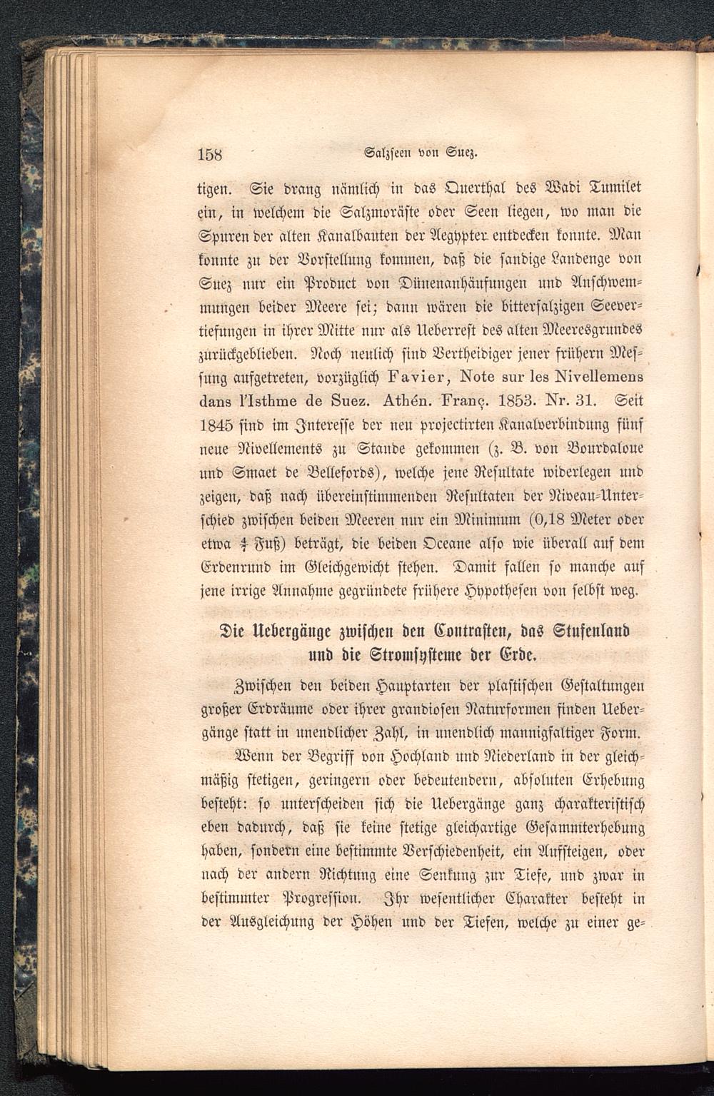 tigen. Sie drang nämlich in das Querthal des Wadi Tumiletein, in welchem die Salzmoräste oder Seen liegen, wo man dieSpuren der alten Kanalbauten der Aeghpter entdecken konnte. Mankonnte zu der Vorstellung kommen, daß die sandige Landenge vonSuez nur ein Product von Dünenanhäufuugen und Anschwem-mungen beider Meere sei; dann wären die bittersalzigen Seever-tiefungen in ihrer Mitte nur als Ueberrest des alten Meeresgrundeszurückgeblieben. Noch neulich sind Vertheidiger jener frühern Mes-sung aufgetreten, vorzüglich ?avier, !>!ote sur les ^ivellemousäavs 1'Istnrne äs Lu<Z2. ^t^vu. ?rar><z. 1853. Ar. 31. Seit1845 find im Interesse der neu projectirteu Kanalverbindung fünfneue Nivellements zu Stande gekommen (z. B. von Bourdaloueund Smaet de Bellesords), welche jene Resultate widerlegen undzeigen, daß nach übereinstimmenden Resultaten der Niveau-Unter-schied zwischen beiden Meeren nur ein Minimum (0,18 Meter oderetwa 5 Fuß) beträgt, die beiden Oceane also wie überall auf demErdenrund im Gleichgewicht stehen. Damit fallen so manche aufjene irrige Annahme gegründete frühere Hypothesen von selbst weg.