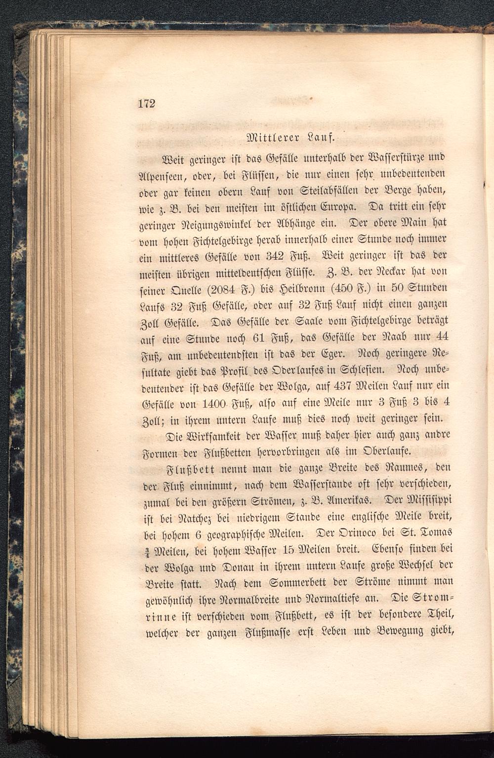 Weit geringer ist das Gefalle unterhalb der Wasscrstürze undAlpcnseen, oder, bei Flüssen, die nur einen sehr unbedeutendenoder gar keinen obern Lauf von Steilabfällen der Berge haben,wie z. B. bei den meisten im östlichen Europa . Da tritt ein sehrgeringer Neigungswinkel der Abhänge ein. Der obere Main hatvom hohen Fichtelgebirge herab innerhalb einer Stnnde noch immerein mittleres Gefalle von 342 Fuß. Weit geringer ist das dermeisten übrigen mitteldeutschen Flüsse. Z. B. der Neckar hat vonseiner Quelle (2084 F.) bis Heilbronu (450 F.) in 50 StundenLaufs 32 Fuß Gefälle, oder auf 32 Fuß Lauf uicht einen ganzenZoll Gefälle. Das Gefälle der Saale vom Fichtelgebirge beträgtauf eine Stunde noch 61 Fuß, das Gefälle der Naab nur 44Fuß, am unbedeutendsten ist das der Eger. Noch geringere Re-sultate giebt das Profil des Oderlaufes in Schlesien . Noch unbe-deutender ist das Gefälle der Wolga , auf 437 Meilen Lauf uur einGefälle von 1400 Fuß, also auf eine Meile nur 3 Fuß 3 bis 4Zoll; in ihrem untern Laufe muß dies uoch weit geringer sein.