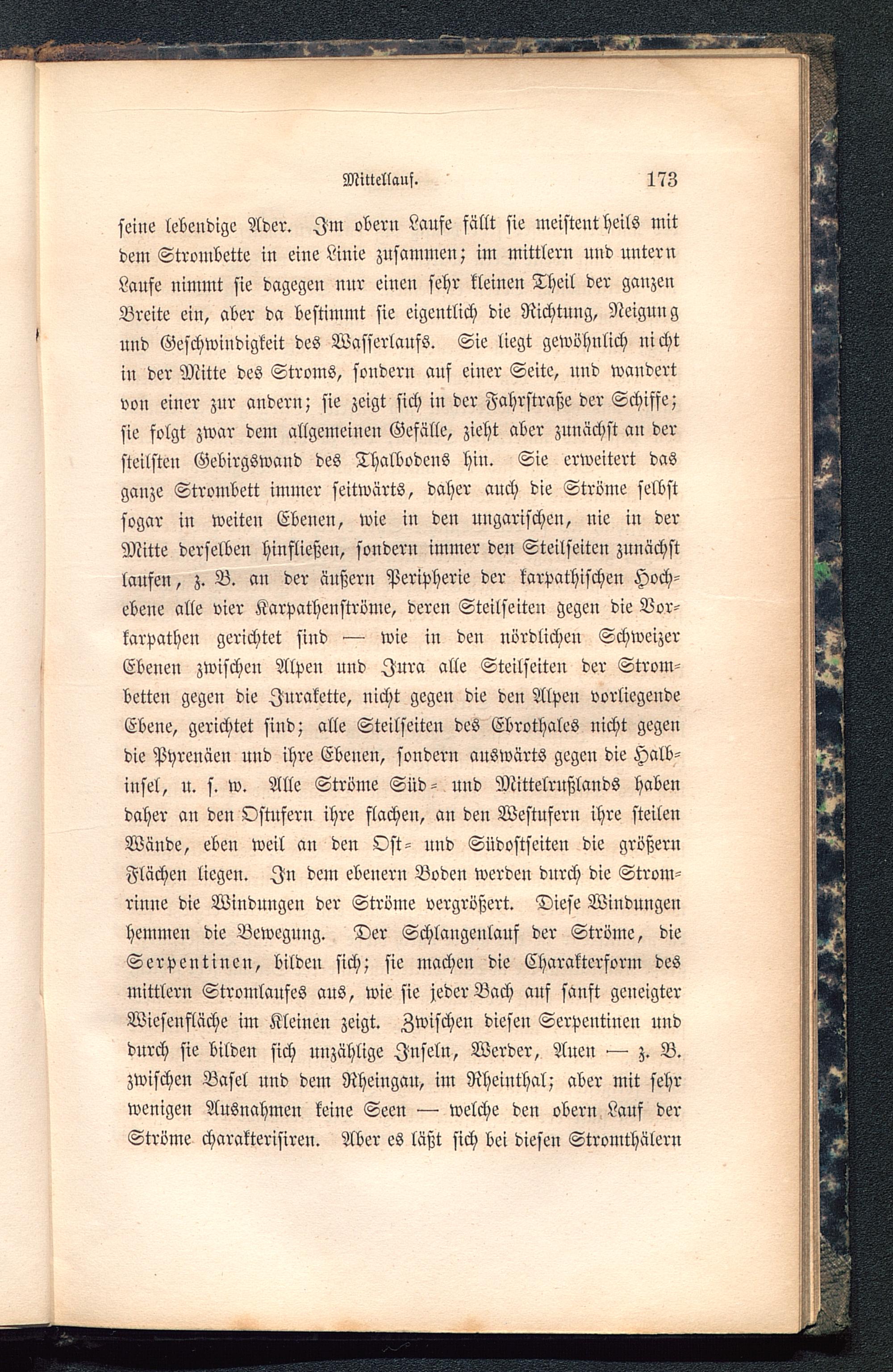 seine lebendige Ader. Im obern Laufe fällt sie meistent Heils mitdem Strombette in eine Linie zusammen; im mittlern und unternLaufe ninimt sie dagegen nur einen sehr kleinen Theil der ganzenBreite ein, aber da bestimmt sie eigentlich die Richtung, Neiguu gund Geschwindigkeit des Wasserlaufs. Sie liegt gewöhnlich nichtin der Mitte des Stroms, sondern auf einer Seite, und wandertvon einer zur andern; sie zeigt sich in der Fahrstraße der Schiffe;sie folgt zwar dem allgemeinen Gefalle, zieht aber zunächst an dersteilsten Gebirgswand des Thalbodens hin. Sie erweitert dasganze Strombett immer seitwärts, daher auch die Ströme selbstsogar in weiten Ebenen, wie in den ungarischen, nie in derMitte derselben hinfließen, sondern immer den Steilseiten zunächstlaufeu, z. B. an der äußern Peripherie der karpathischen Hoch-ebene alle vier Karpatheuströme, deren Steilseiten gegen die Vor-karpathen gerichtet sind — wie in den nördlichen Schweizer Ebenen zwischen Alpen und Jura alle Steilseiten der Strom-betten gegen die Iurakette, nicht gegen die den Alpen vorliegendeEbene, gerichtet sind; alle Steilseiten des Ebrothales nicht gegendie Pyrenäen und ihre Ebenen, sondern auswärts gegen die Halb-insel, u. s. w. Alle Ströme Süd- und Mittelrnßlands habendaher an den Ostufern ihre flachen, an den Westufern ihre steilenWände, eben weil an den Ost- und Südostseiten die größernFlächen liegen. In dem ebenern Boden werden durch die Strom-rinne die Windungen der Ströme vergrößert. Diese Windungenhemmen die Bewegung. Der Schlangenlauf der Ströme, dieSerpentinen, bilden sich; sie machen die Charakterform desmittlern Stromlaufes aus, wie sie jeder Bach auf sanft geneigterWiesenfläche im Kleinen zeigt. Zwischen diesen Serpentinen unddurch sie bilden sich unzählige Inseln, Werder, Auen — z. B.zwischen Basel und dem Rheingau, im Rheinthal; aber mit sehrwenigen Ausnahmen keine Seen — welche den obern Lauf derStröme charakterisiren. Aber es läßt sich bei diesen Stromthälern
