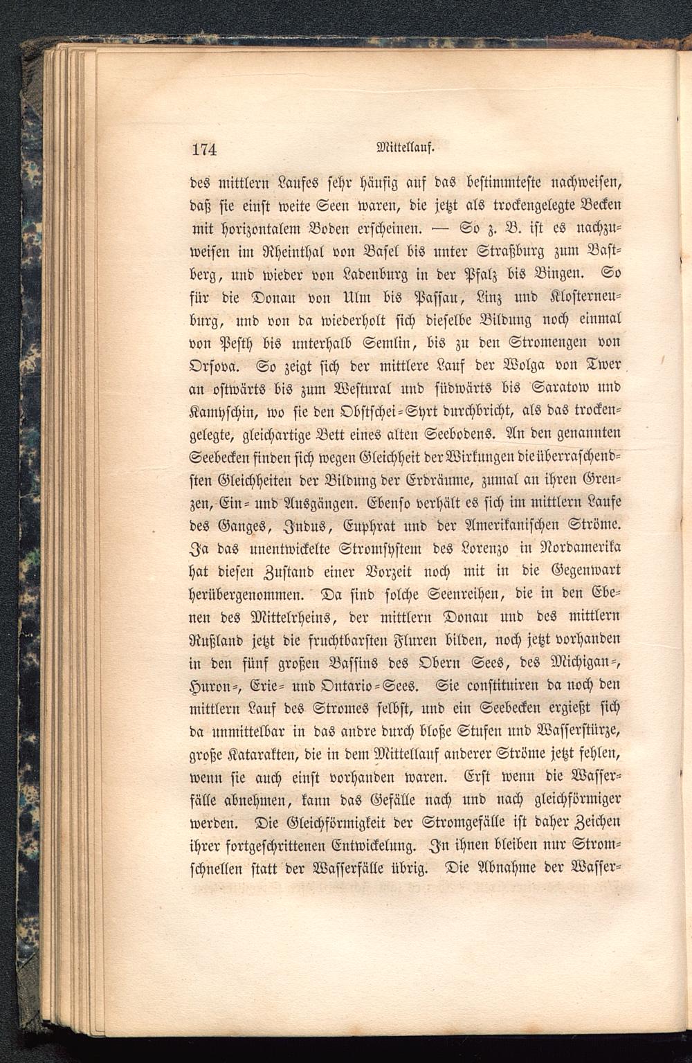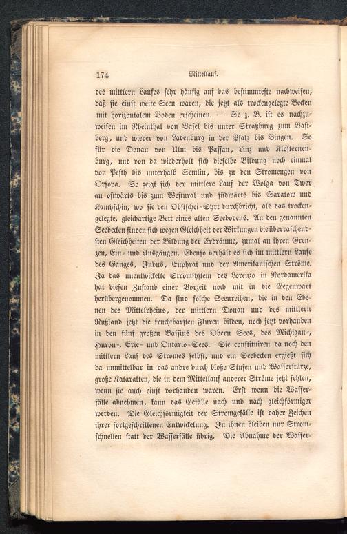 des mittlern Laufes sehr häufig auf das bestimmteste nachweisen,daß sie einst weite Seen waren, die jetzt als trockengelegte Beckenmit horizontalem Boden erscheinen. So z. B. ist es nachzu-weisen im Rheinthal von Basel bis unter Straßburg zum Bast-berg, uud wieder von Ladenburg iu der Pfalz bis Biugen. Sofür die Donau vou Ulm bis Passau, Linz und Klosterneu-burg , und von da wiederholt sich dieselbe Bildung noch einmalvon Pesth bis unterhalb Semlin, bis zu den Stromengen vonOrsova. So zeigt sich der mittlere Lauf der Wolga von Twer an ostwärts bis zum Westural uud südwärts bis Saratow undKamyschin, wo sie den Obstschei-Shrt durchbricht, als das trocken-gelegte, gleichartige Bett eines alten Seebodens. An den genanntenSeebecken finden sich wegen Gleichheit derWirkungen die überraschend-sten Gleichheiten der Bildung der Erdräume, zumal an ihren Gren-zen, Ein- und Ansgäugen. Ebenso verhält es sich im mittlern Laufedes Ganges, Indus, Envhrat und der Amerikanischen Ströme.Ja das unentwickelte Stromshstem des Lorenzo in Nordamerika hat diesen Zustand einer Vorzeit noch mit in die Gegenwartherübergenommen. Da sind solche Seenreihen, die in den Ebe-nen des Mittelrheins, der mittlern Donau und des mittlernRußland jetzt die fruchtbarsten Fluren bilden, noch jetzt vorhandenin den fünf großen Bassins des Obern Sees, des Michigan -,Huron-, Erie - und Ontario-Sees. Sie constitniren da noch denmittlern Lauf des Stromes selbst, und ein Seebecken ergießt sichda unmittelbar in das andre durch bloße Stufen und Wasserstürze,große Katarakten, die in dem Mittellauf anderer Ströme jetzt fehlen,wenn sie auch einst vorhanden wareu. Erst wenn die Wasser-fälle abnehmen, kann das Gefälle nach und nach gleichförmigerwerdeu. Die Gleichförmigkeit der Stromgefälle ist daher Zeichenihrer fortgeschrittenen Entwickelung. In ihnen bleiben nur Strom-schnellen statt der Wasserfälle übrig. Die Abnahme der Wasser-